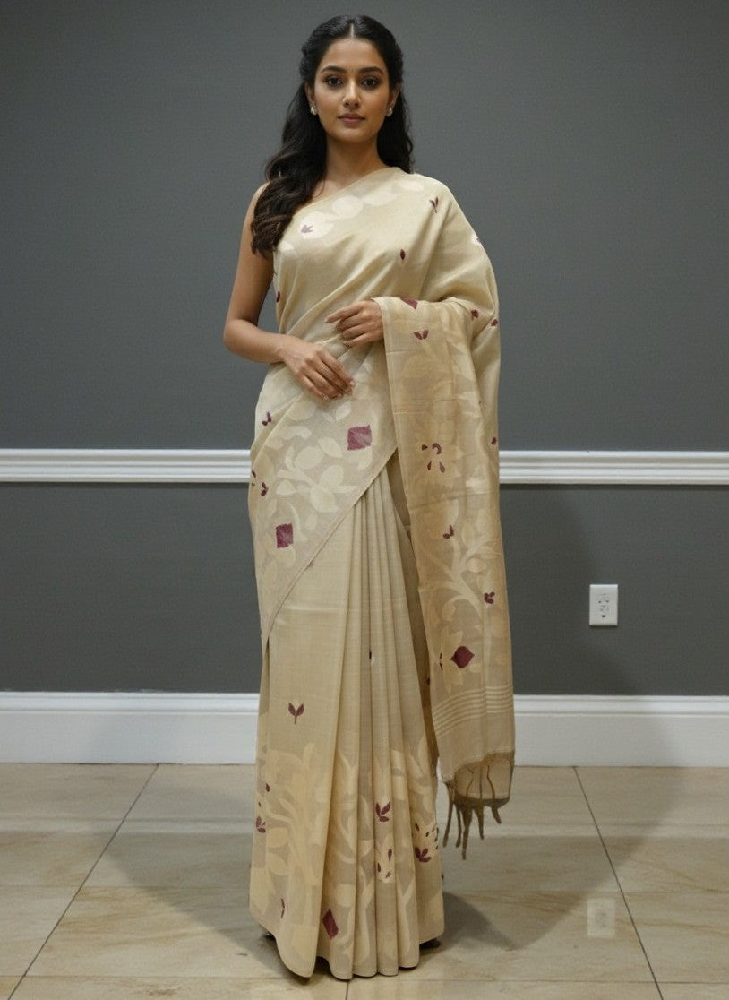 Pure Linen Saree with Floral Jaal Work & Checks Weave