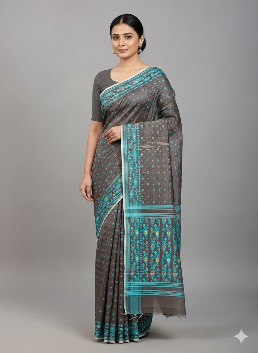 This elegant Dhakai Jamdani comes in an ash-grey base with delicate teal-toned woven motifs throughout the body. Finished with a bold contrast border and decorative pallu, it offers a refined yet contemporary look, ideal for office wear and daytime occasions.