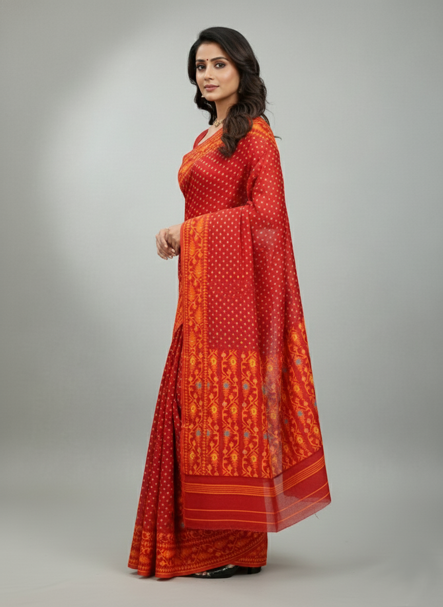 A vibrant red Dhakai Jamdani with finely detailed woven motifs throughout the body and a bold traditional pallu. Rich in colour yet soft in feel, this saree is a great choice for festivals, family functions, and celebratory occasions.