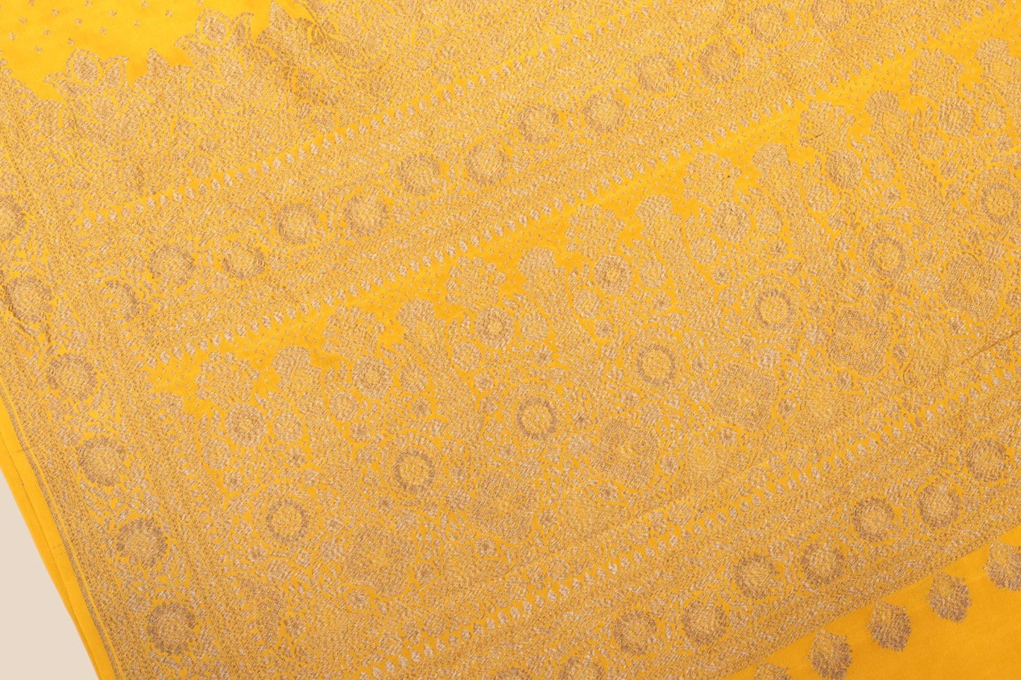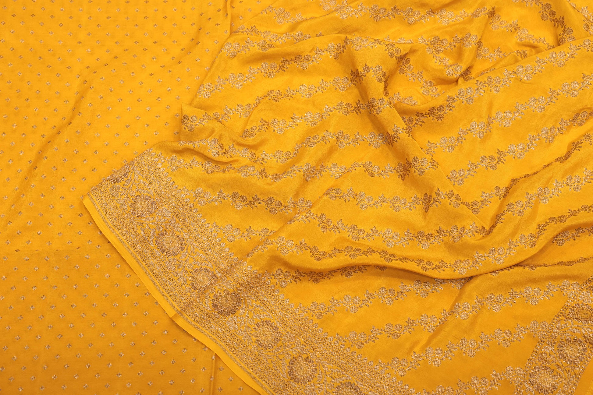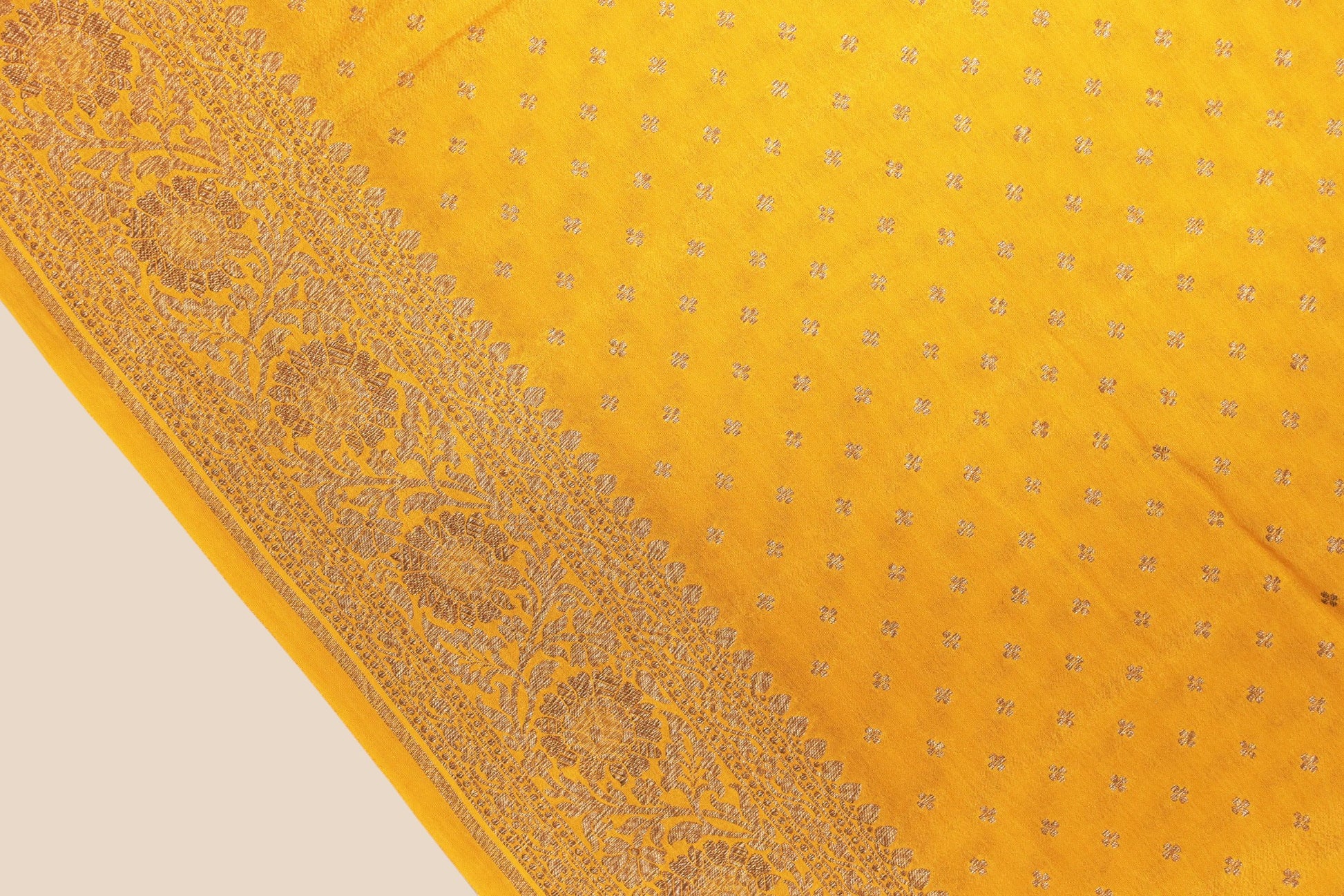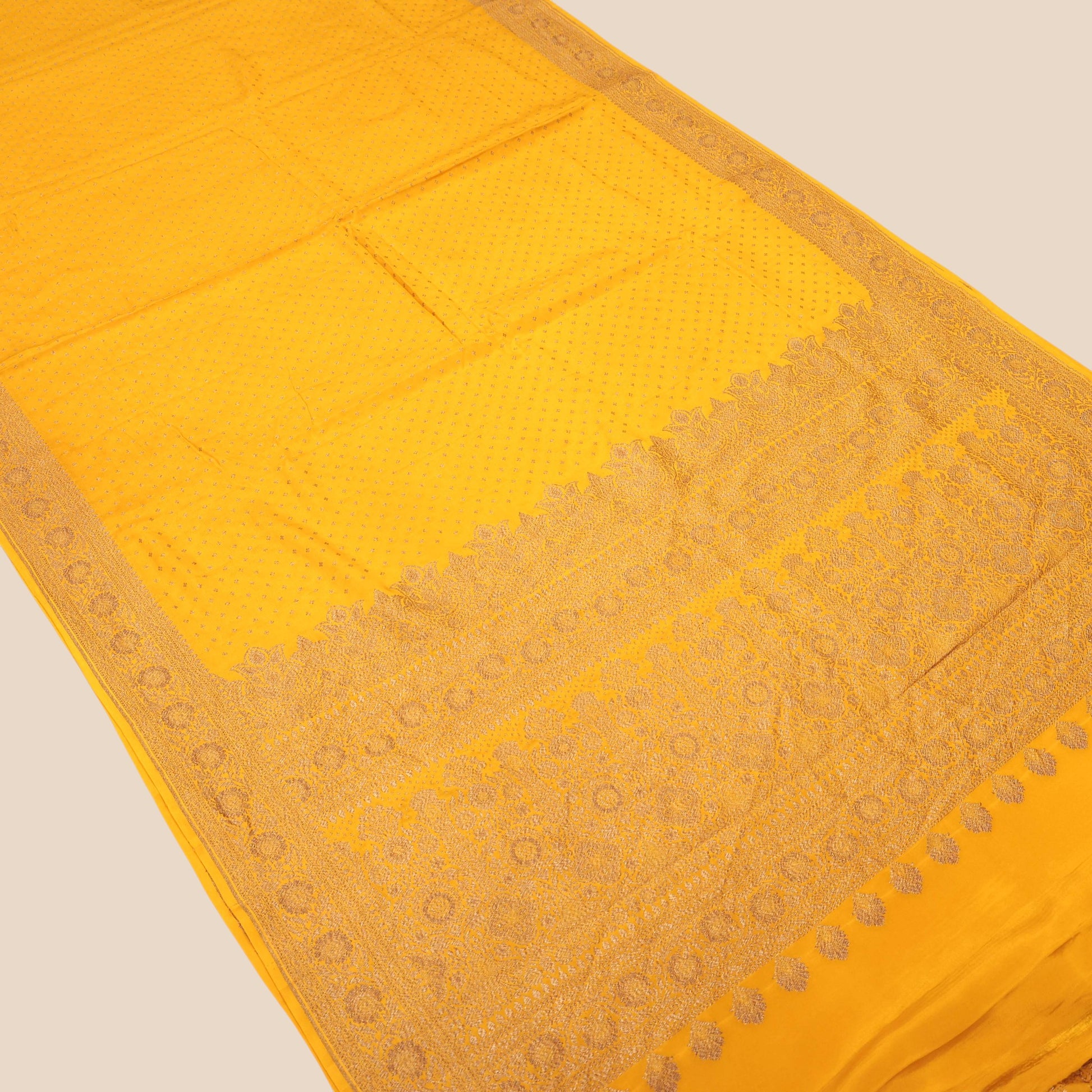 This radiant pure crepe Banarasi saree in a rich mustard yellow hue is hand-woven with understated elegance. The body is adorned with delicate antique zari booties that lend a soft, graceful charm to the drape. Finished with a clean and classic aanchal and a beautifully detailed antique zari border, the saree reflects timeless Banarasi craftsmanship. Lightweight yet rich in appeal, it is an ideal choice for daytime festivities, intimate celebrations, and traditional gatherings.