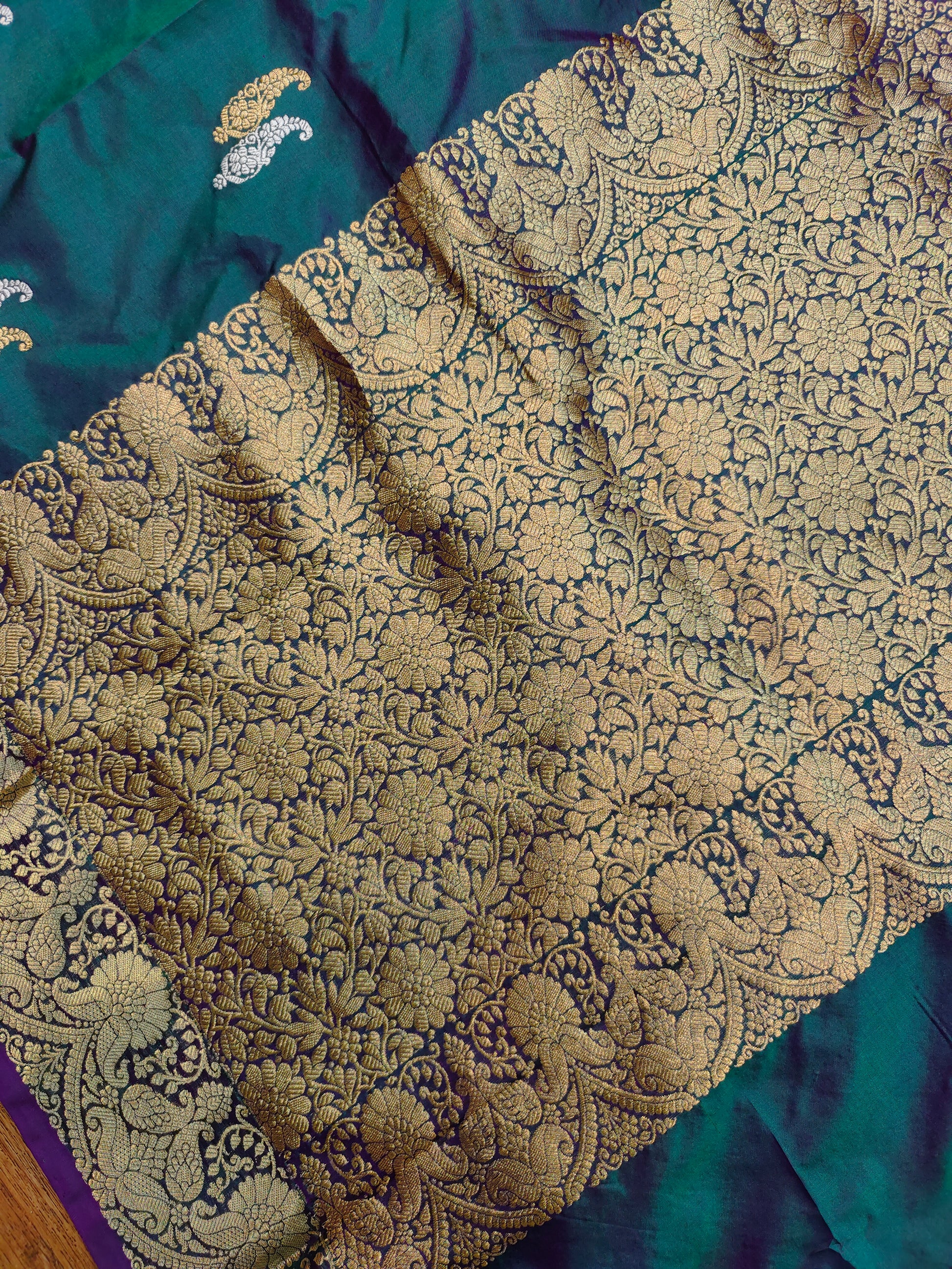 Deep Teal Green Kataan Silk Banarasi Saree with Antique Gold Zari Border