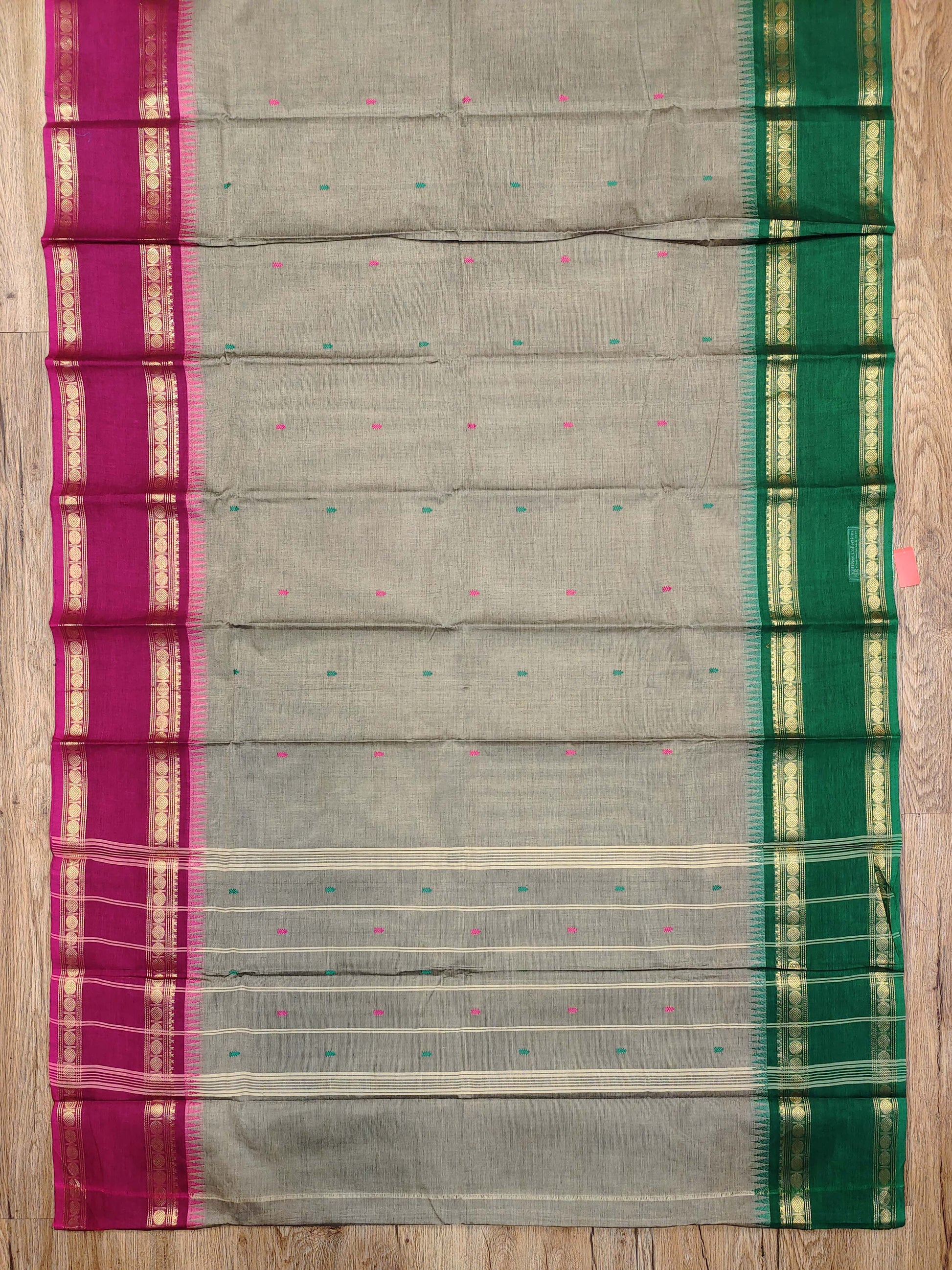 This elegant Kanchi cotton saree in a soft grey shade features delicate motifs and vibrant contrast borders that add a refreshing touch of color. The pure cotton fabric ensures comfort and breathability, making it perfect for daytime events, office wear, and small festive gatherings.