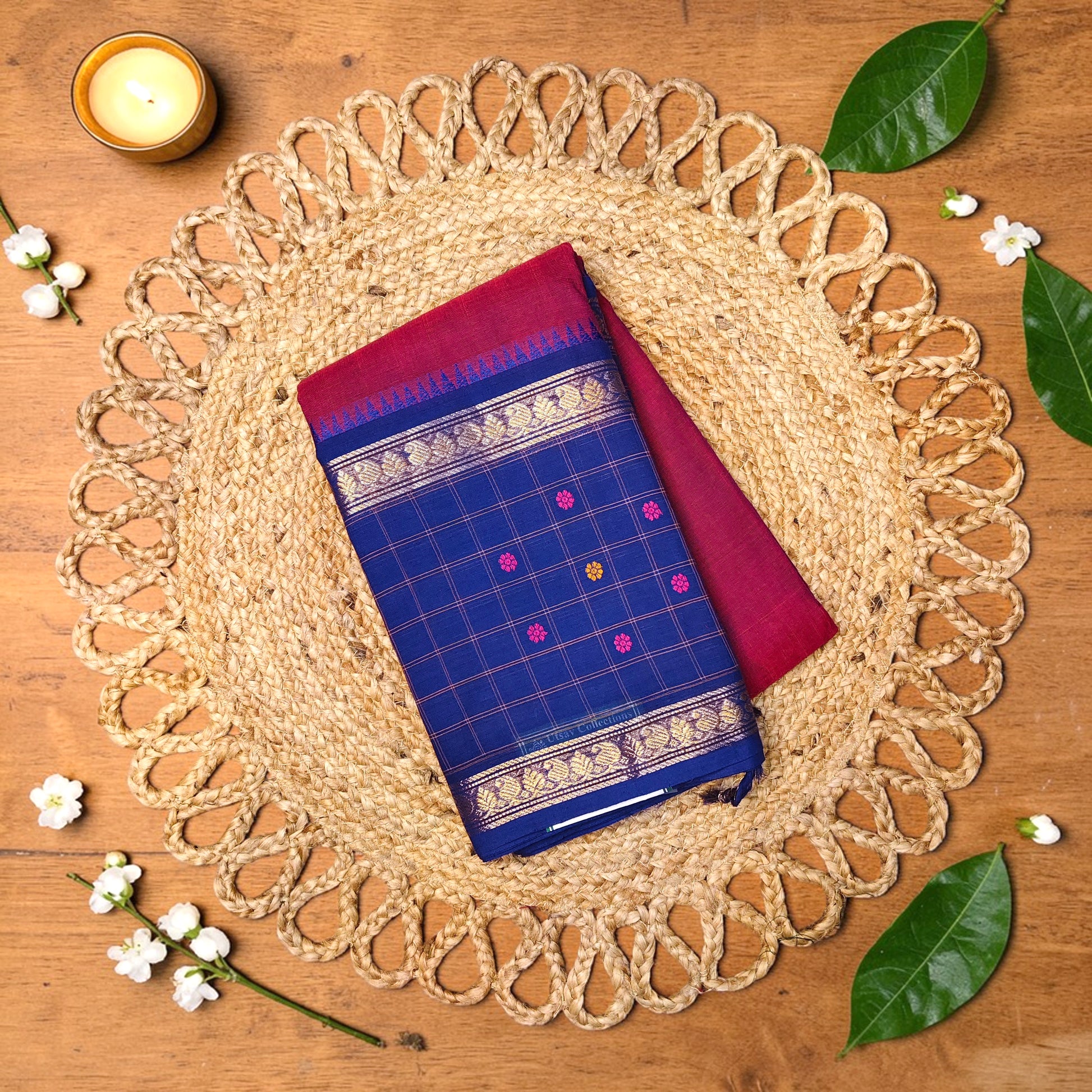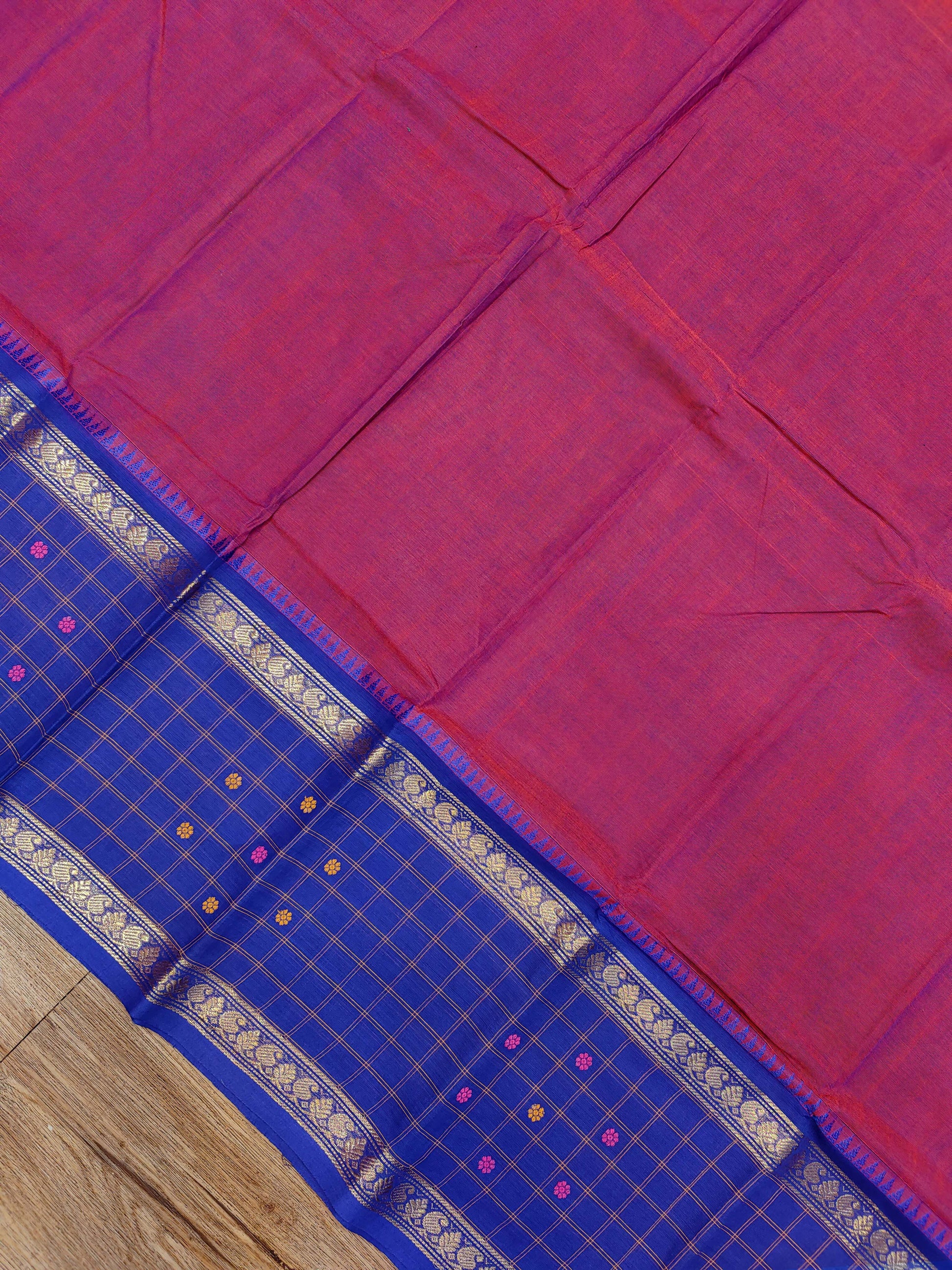 A striking Kanchi cotton saree in a rich magenta tone, highlighted with a beautiful checked border that adds a classic traditional character. Lightweight and comfortable, this pure cotton saree is easy to drape and perfect for formal occasions, small celebrations, and everyday elegance.