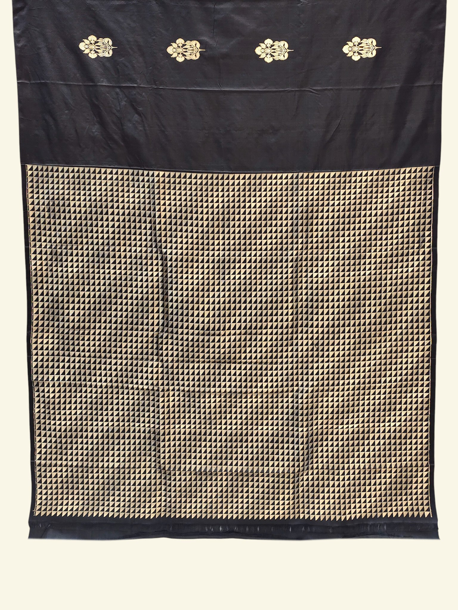 Experience timeless elegance with this pure handwoven Banarasi Mashru silk saree, crafted to perfection by skilled artisans. Designed as a borderless saree, it creates a seamless, elongated silhouette that beautifully enhances height and grace. The body features delicate motifs woven with light gold zari, adding a soft, refined shimmer without overpowering the look. The pallu is intricately detailed with elegant zari work, lending a classic Banarasi charm. Paired with a rich brocade blouse piece, intricately designed to complement the saree, this piece is perfect for weddings, festive occasions, and elegant soirées.