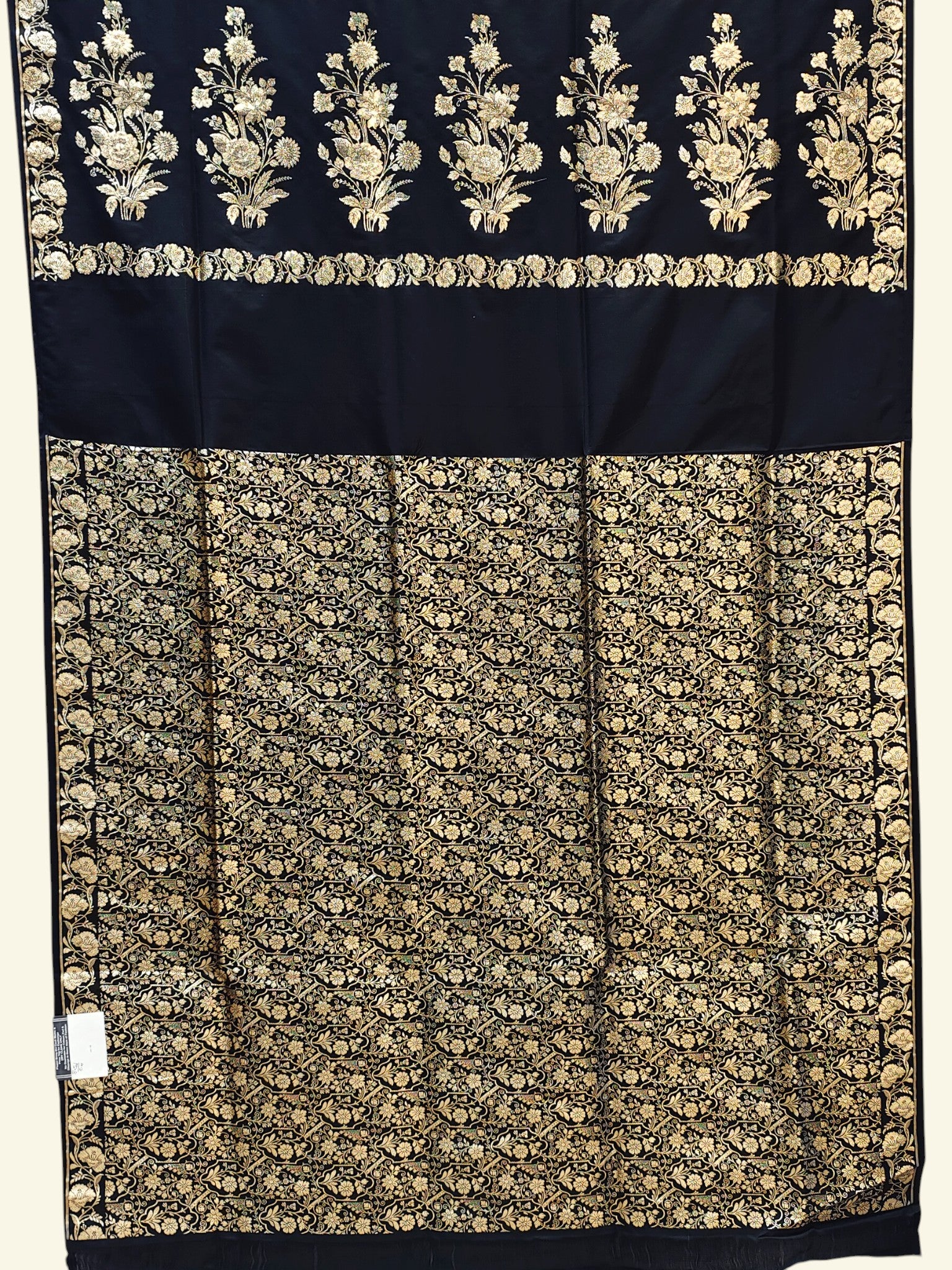 The body of the saree is adorned with delicate zari booties, evenly spread to create a refined and understated elegance. The saree is beautifully framed with an intricately woven Banarasi border, adding depth and traditional charm. The highlight lies in the pallu, which features ornate floral zari motifs woven in a striking pattern, giving the saree a regal yet balanced appeal.