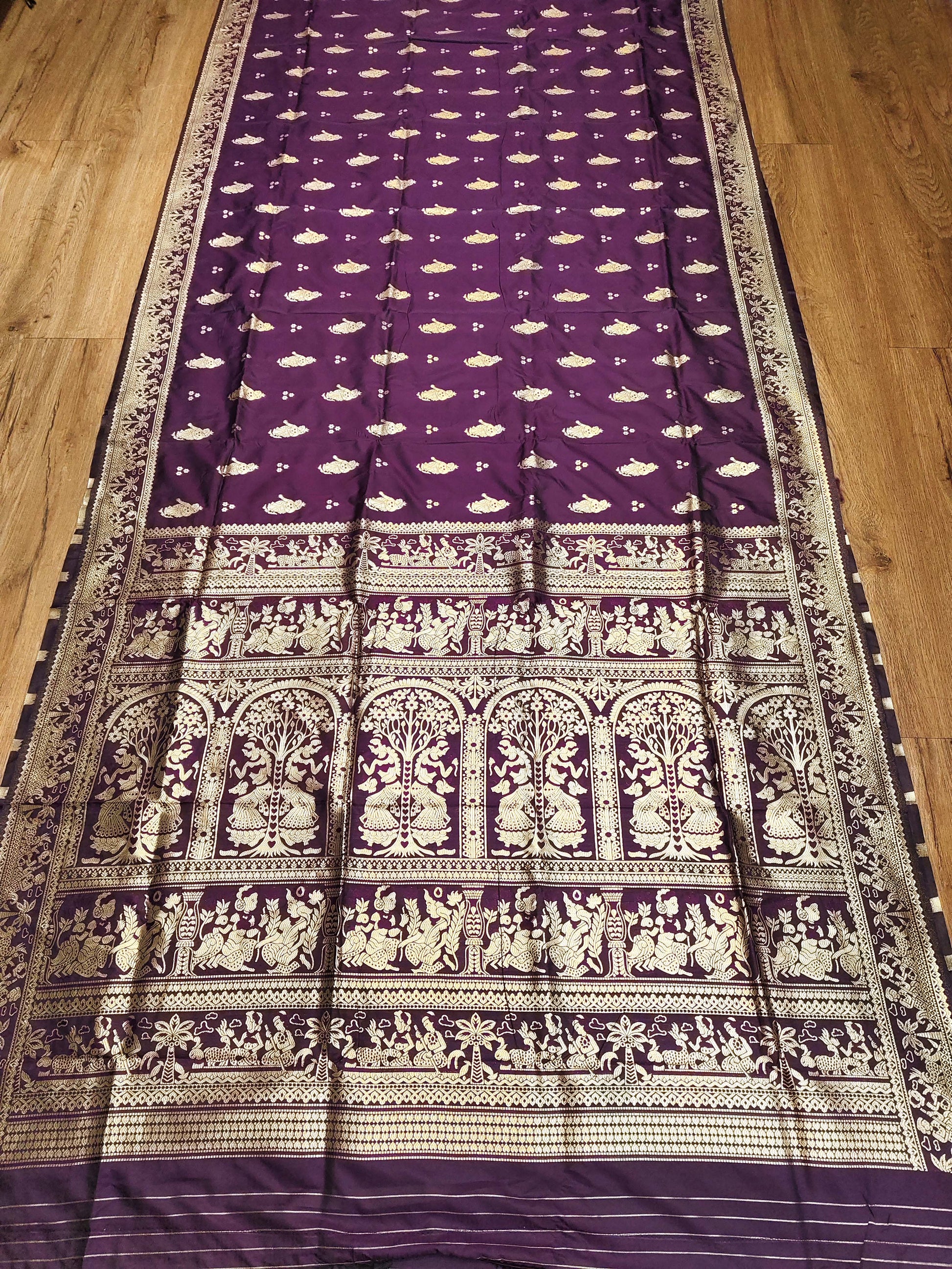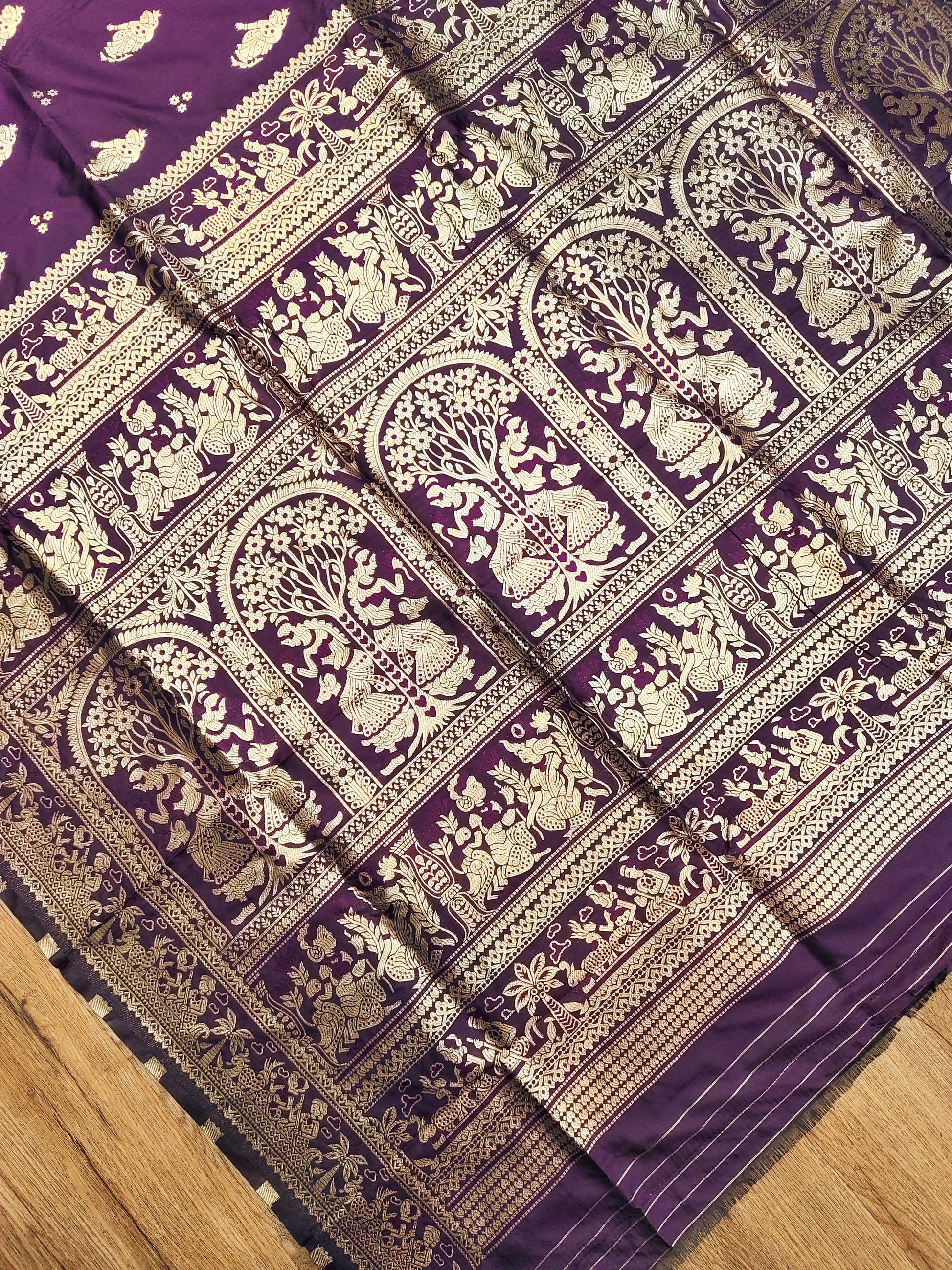 This royal purple Swarnachari saree is woven in classic Baluchari-style on a soft blend fabric. The body has zari motifs with matching purple Meena work, giving it an elegant tone-on-tone look. Detailed border and woven pallu add a festive touch. Includes an attached blouse piece with small booties and border.