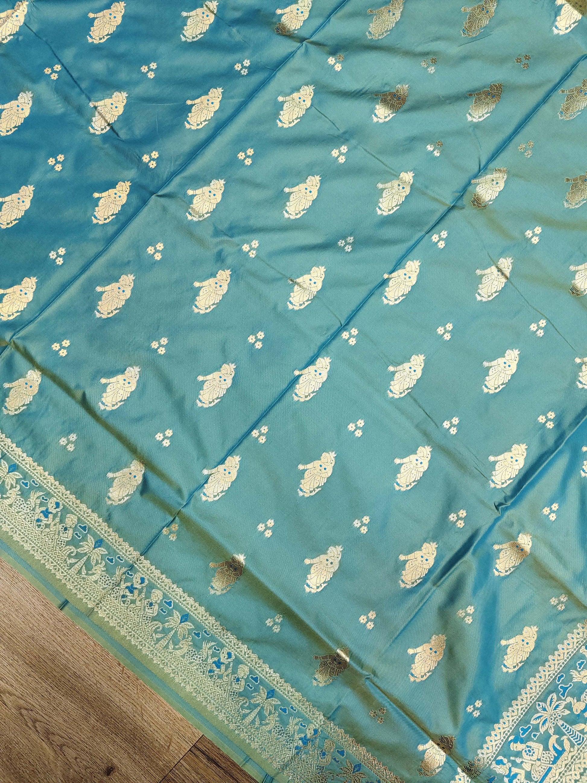 A graceful sea green Swarnachari saree featuring an elegant gold zari finish for a rich festive look. Woven on premium blend fabric, it comes with delicate zari butis across the body and a beautifully detailed woven border. The highlight is its traditional Swarnachari pallu, adorned with classic dancing lady motifs and floral detailing, giving it a timeless heritage touch. Comes with an attached blouse piece featuring small bootis and a matching border.