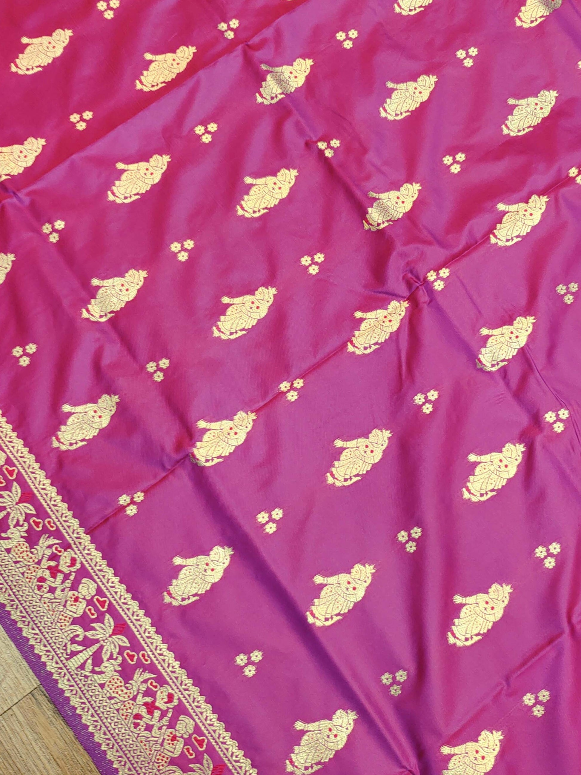 A stunning magenta Swarnachari saree that blends bold color with timeless tradition. Crafted in smooth blend fabric, it features elegant zari butis across the body and a beautifully woven border. The pallu is richly detailed with classic Swarnachari motifs including dancing lady figures, floral vines, and heritage patterns, making it ideal for festive wear and wedding functions. Comes with an attached blouse piece featuring small bootis and a matching border.