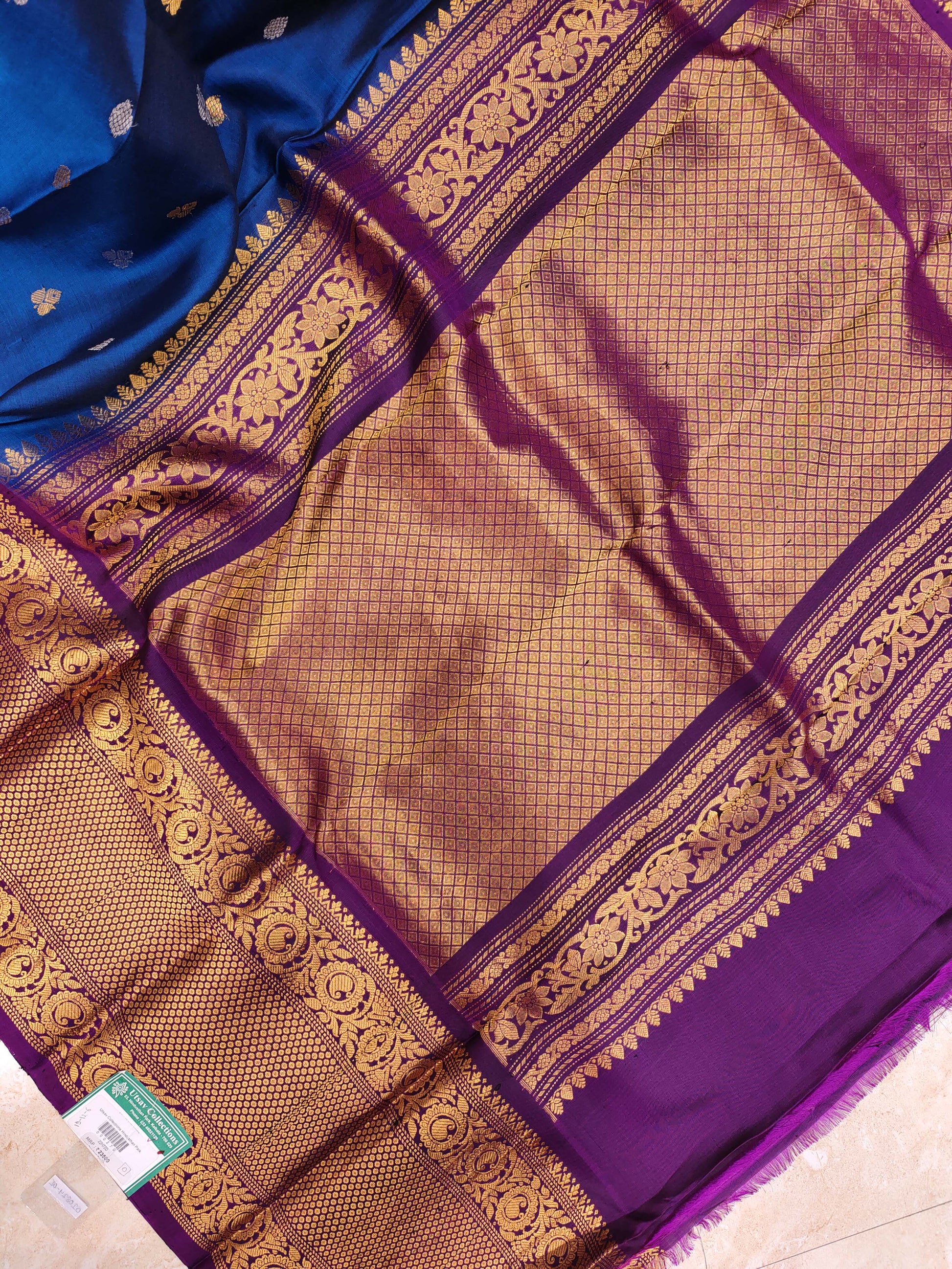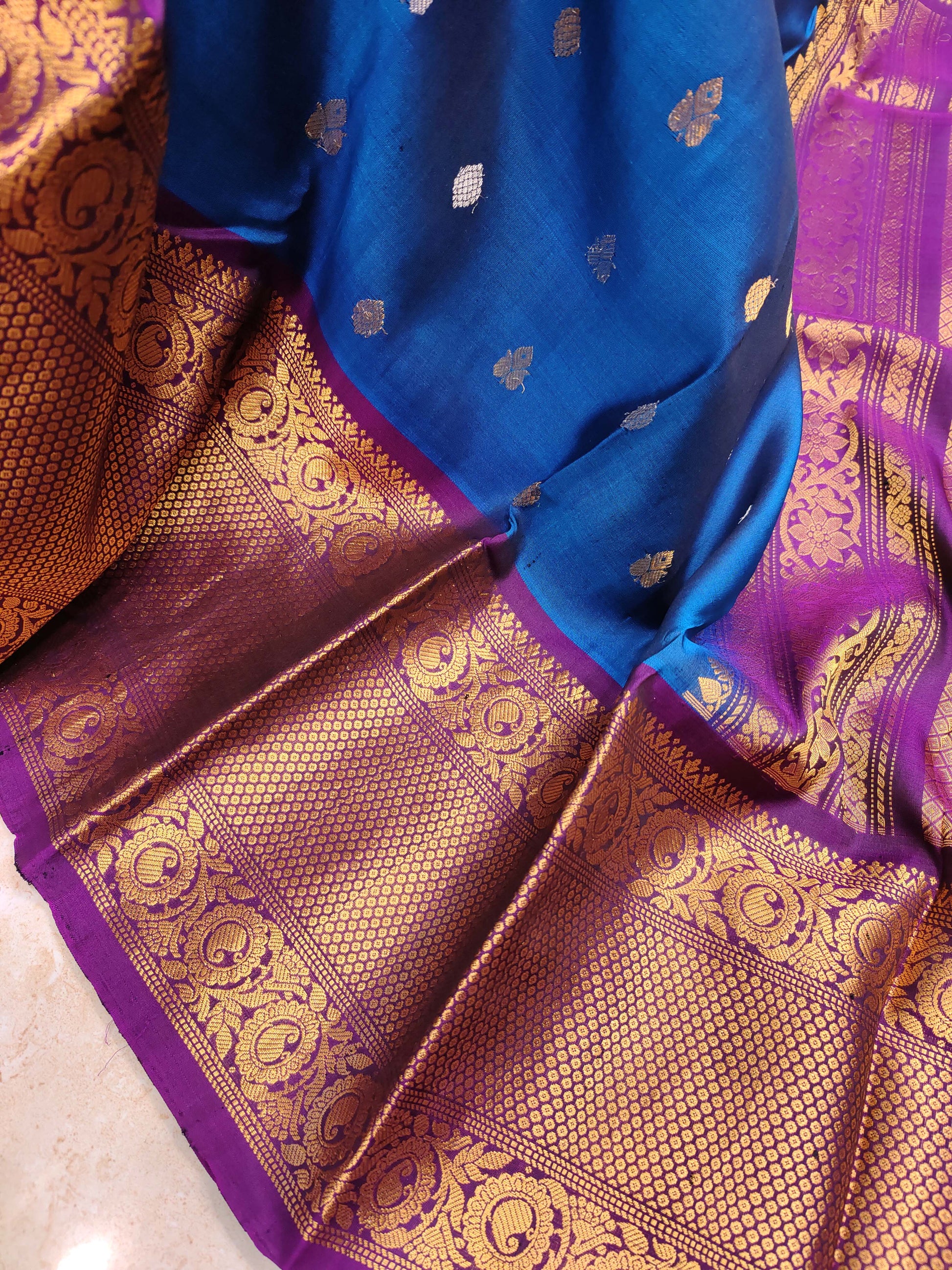 Step into timeless elegance with this pure silk Kanjivaram saree in a rich royal blue shade, beautifully paired with a striking deep purple contrast border. The body is adorned with delicate butti motifs in a mix of gold and silver zari, giving the saree a classy festive look. The highlight of this piece is its grand traditional Kanjivaram pallu, woven in heavy antique gold zari with a rich all-over pattern and finished with floral detailing. The broad border features classic Kanjivaram weaving with intricate zari work, making it a perfect choice for weddings and special occasions. Blouse Piece Included: Matching purple silk blouse piece with zari border.