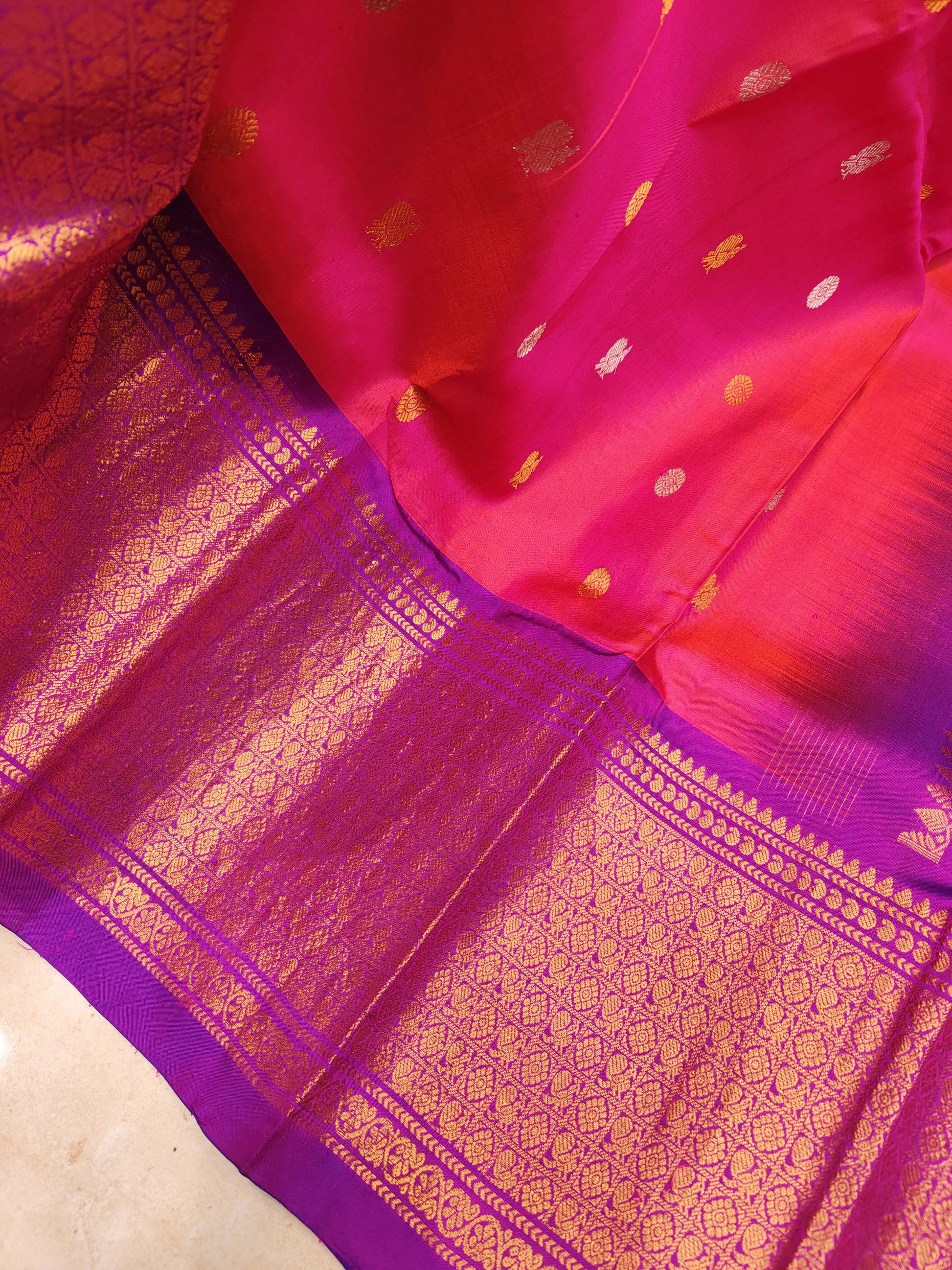 Elevate your festive look with this stunning pure silk Kanjivaram saree in a vibrant rani pink shade, beautifully paired with a rich contrast purple border and pallu. The body is adorned with elegant gold and silver zari bootis, giving it a graceful shine while keeping the look premium and balanced. The saree features a grand traditional Kanjivaram pallu, woven with intricate antique gold zari patterns and finished with a broad, richly detailed border. A perfect choice for weddings, festive celebrations, and traditional occasions. ? Blouse Piece Included: Contrast purple silk blouse piece with zari border.