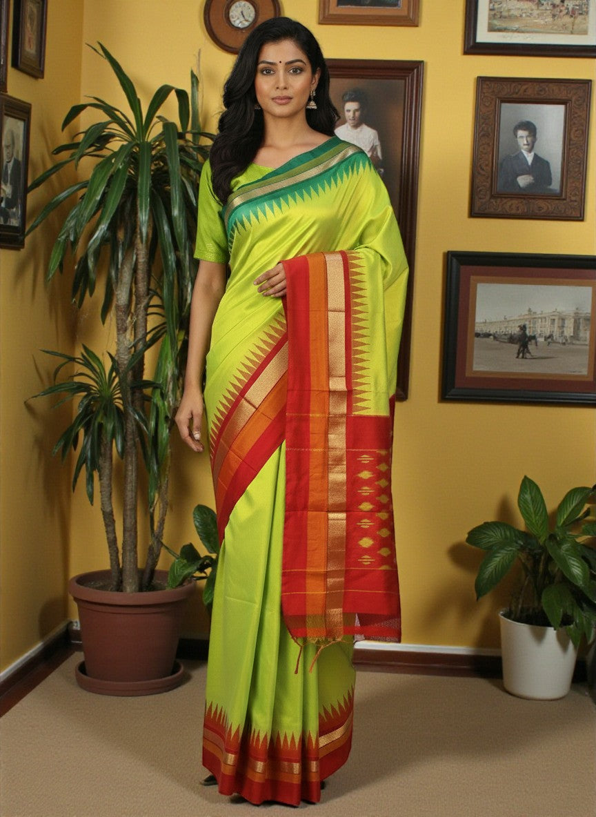 This Pure Pochampalli Silk Saree is handwoven in fine quality silk, featuring a luminous lime-green body beautifully contrasted with a rich red border and pallu adorned with traditional geometric motifs. The crisp weave, natural silk sheen, and smooth texture give the saree an exotic feel and a graceful drape, making it an ideal choice for festive occasions, weddings, and special celebrations.