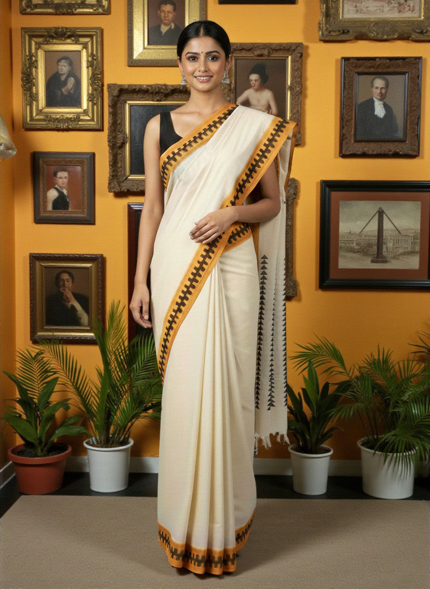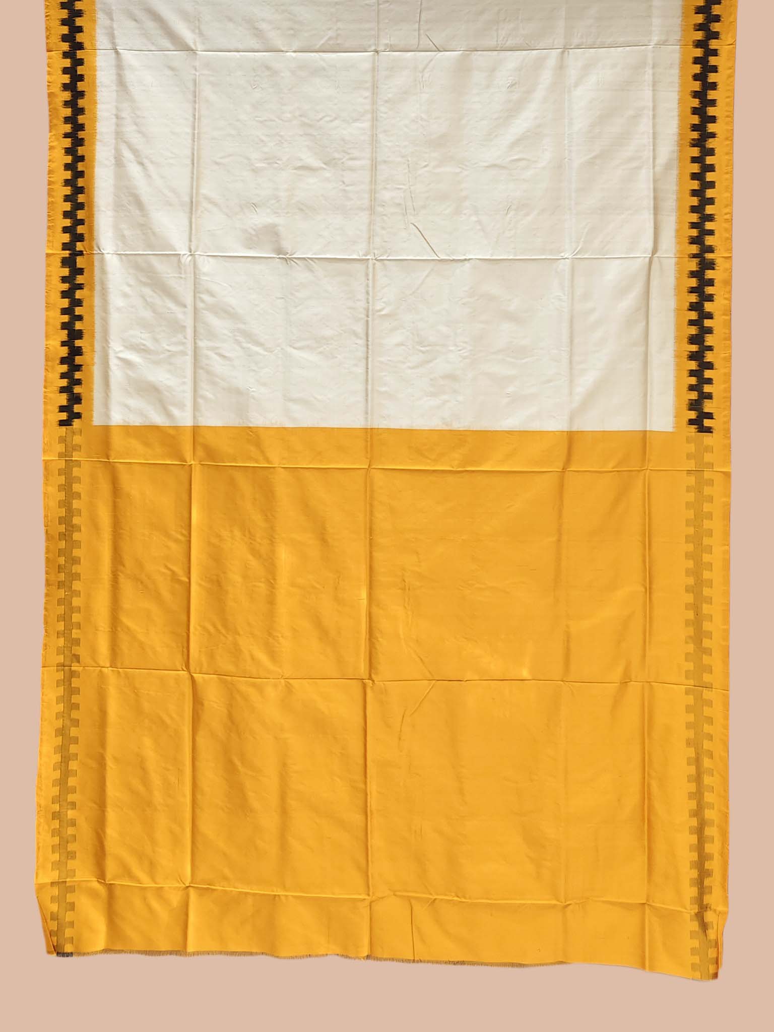 This Pure Pochampalli Silk Saree is handwoven in fine quality silk, featuring a serene ivory body highlighted with traditional geometric motifs and beautifully framed by a rich mustard border. The crisp weave, natural silk sheen, and smooth texture give the saree an exotic feel and an elegant drape, making it a perfect choice for festive occasions, weddings, and special celebrations.