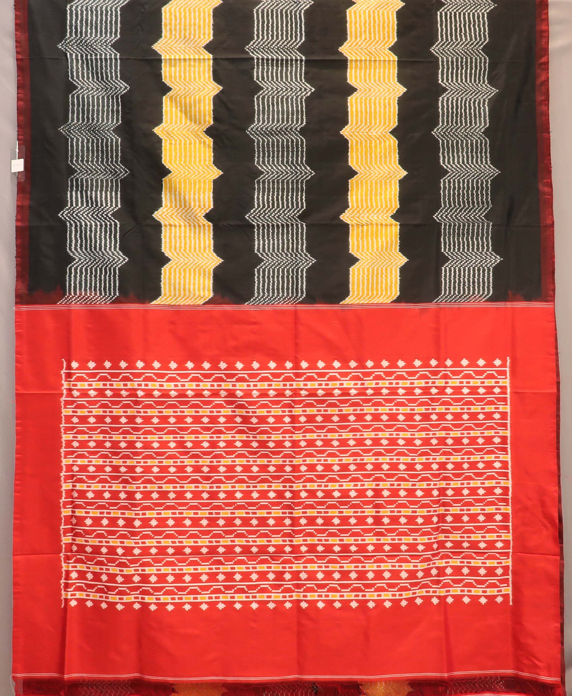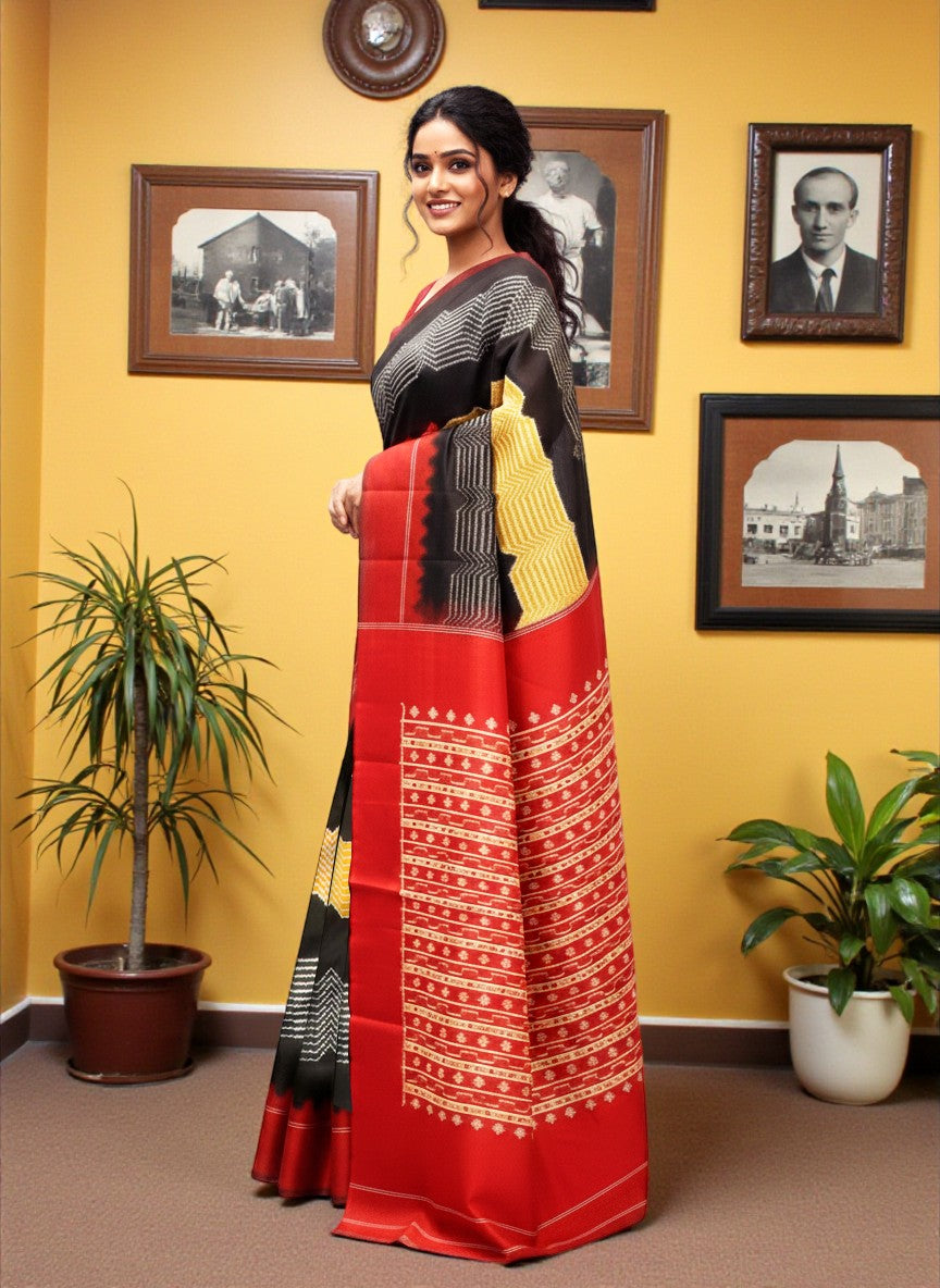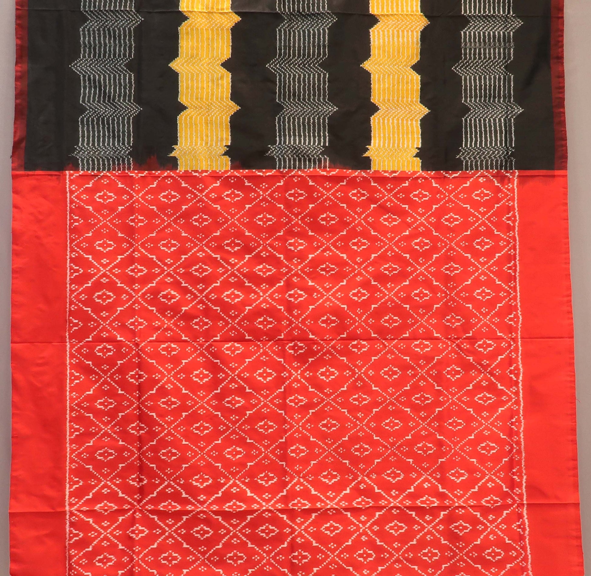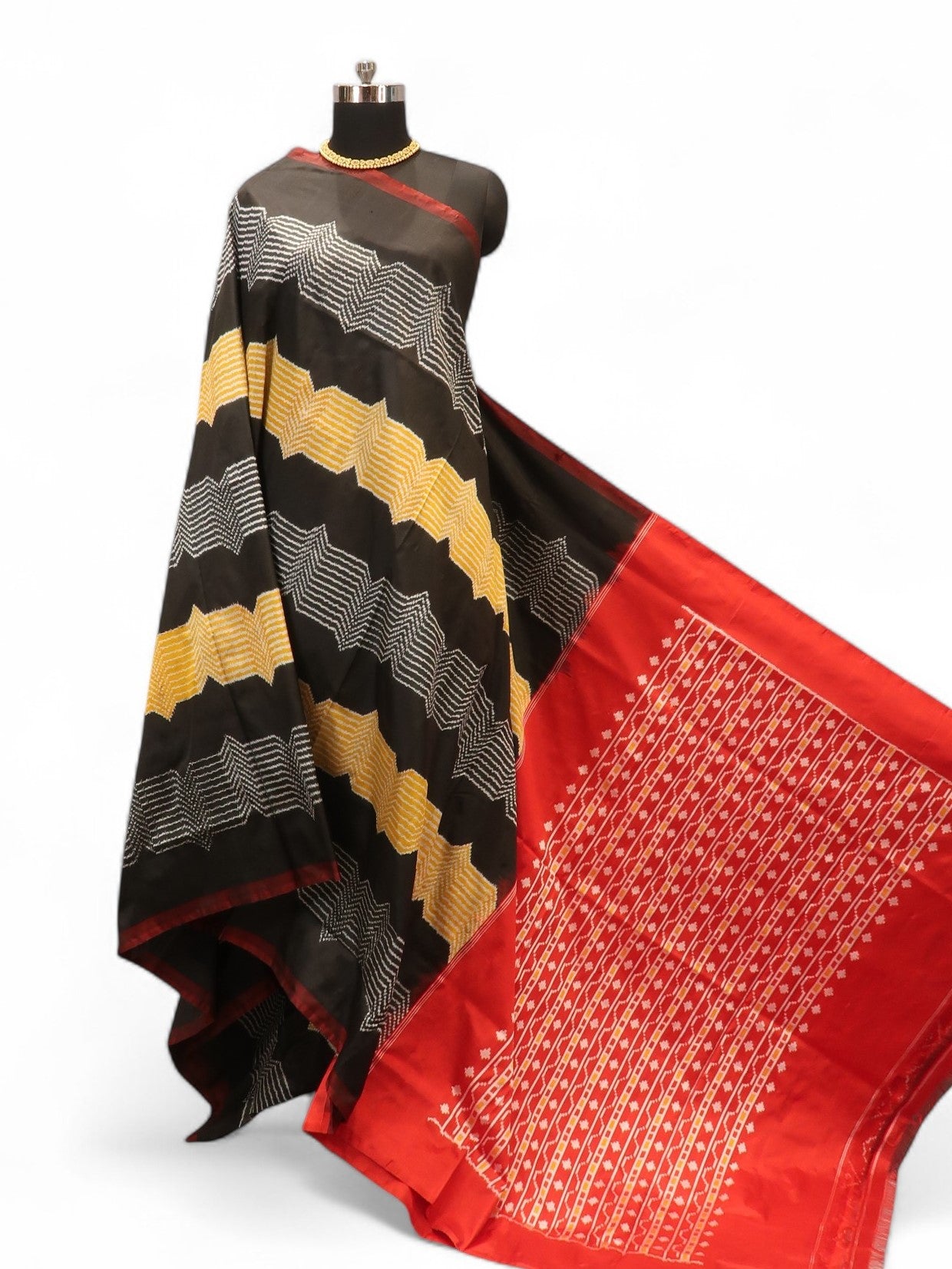 This Pure Pochampalli Silk Saree is handwoven in fine quality silk, featuring striking geometric patterns across the body, beautifully contrasted with a rich red pallu that adds depth and vibrancy. The smooth texture and natural sheen of pure silk give the saree an exotic feel and an elegant drape, making it perfect for festive occasions, weddings, and special celebrations.