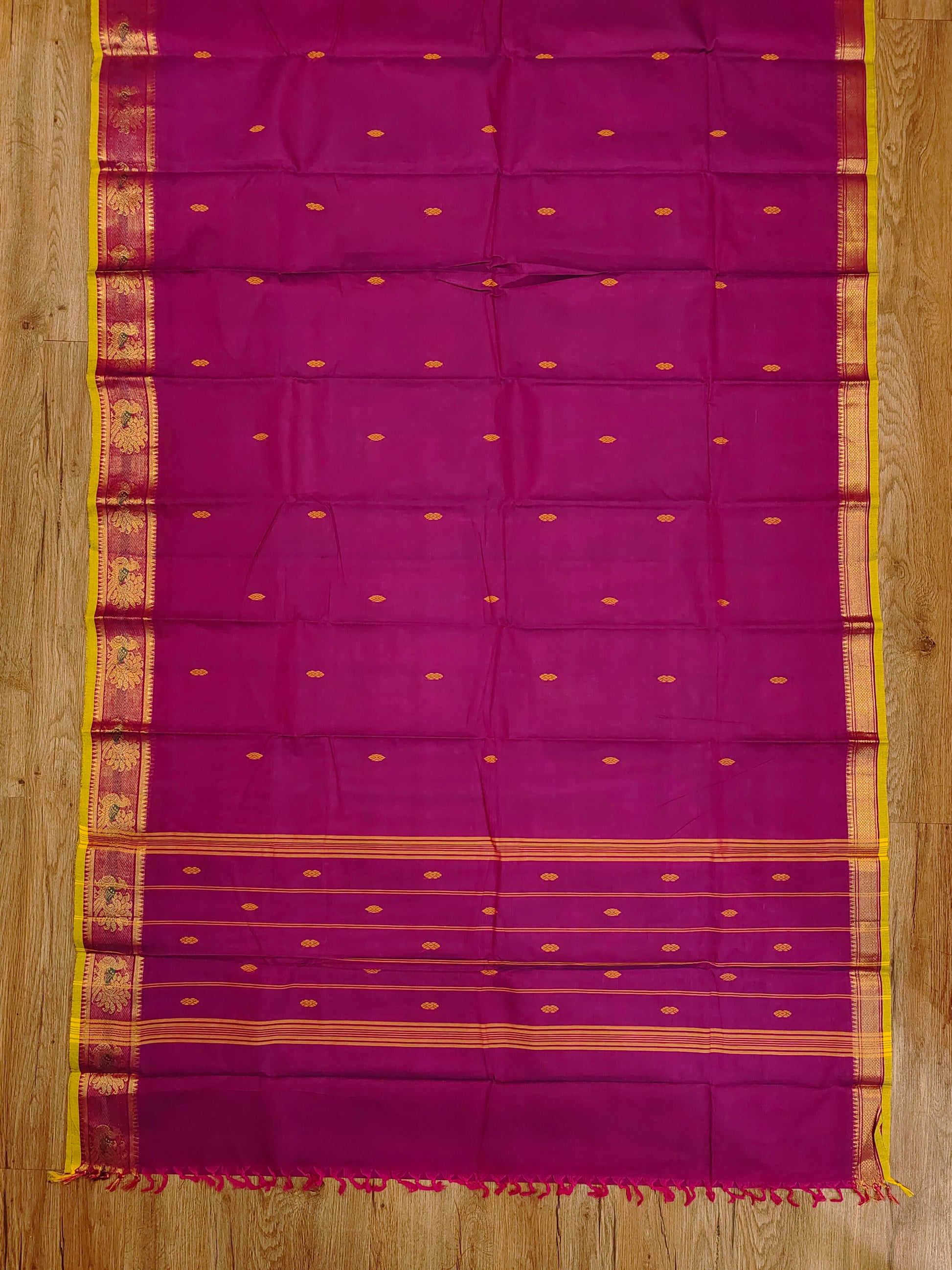A rich wine-purple Kanchi cotton saree that looks elegant yet wearable for everyday occasions. The minimal body with a subtle butti gives it a classy finish, while the traditional gold zari border adds that signature Kanchi charm. A beautiful pick for office wear, small functions, or gifting.