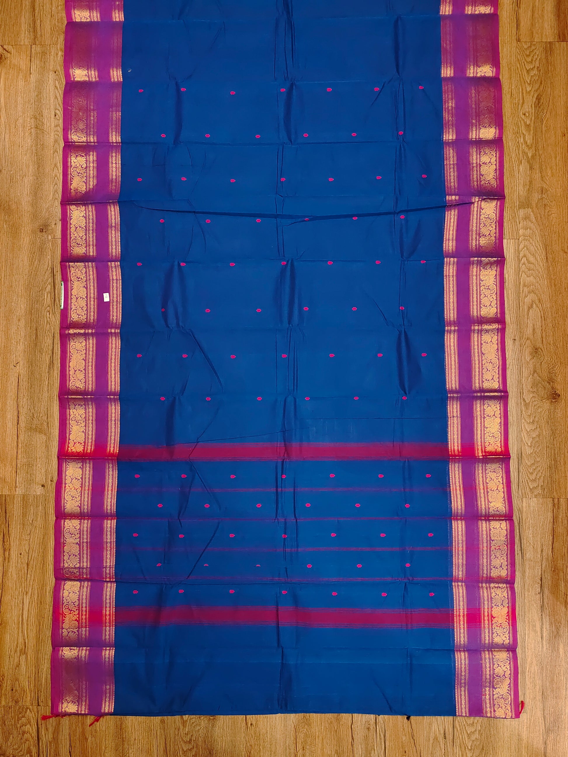 A bold royal blue Kanchi cotton saree finished with a gorgeous purple and gold woven border. The contrast is strong and premium-looking, making this saree perfect for evening wear, family functions, and traditional celebrations.