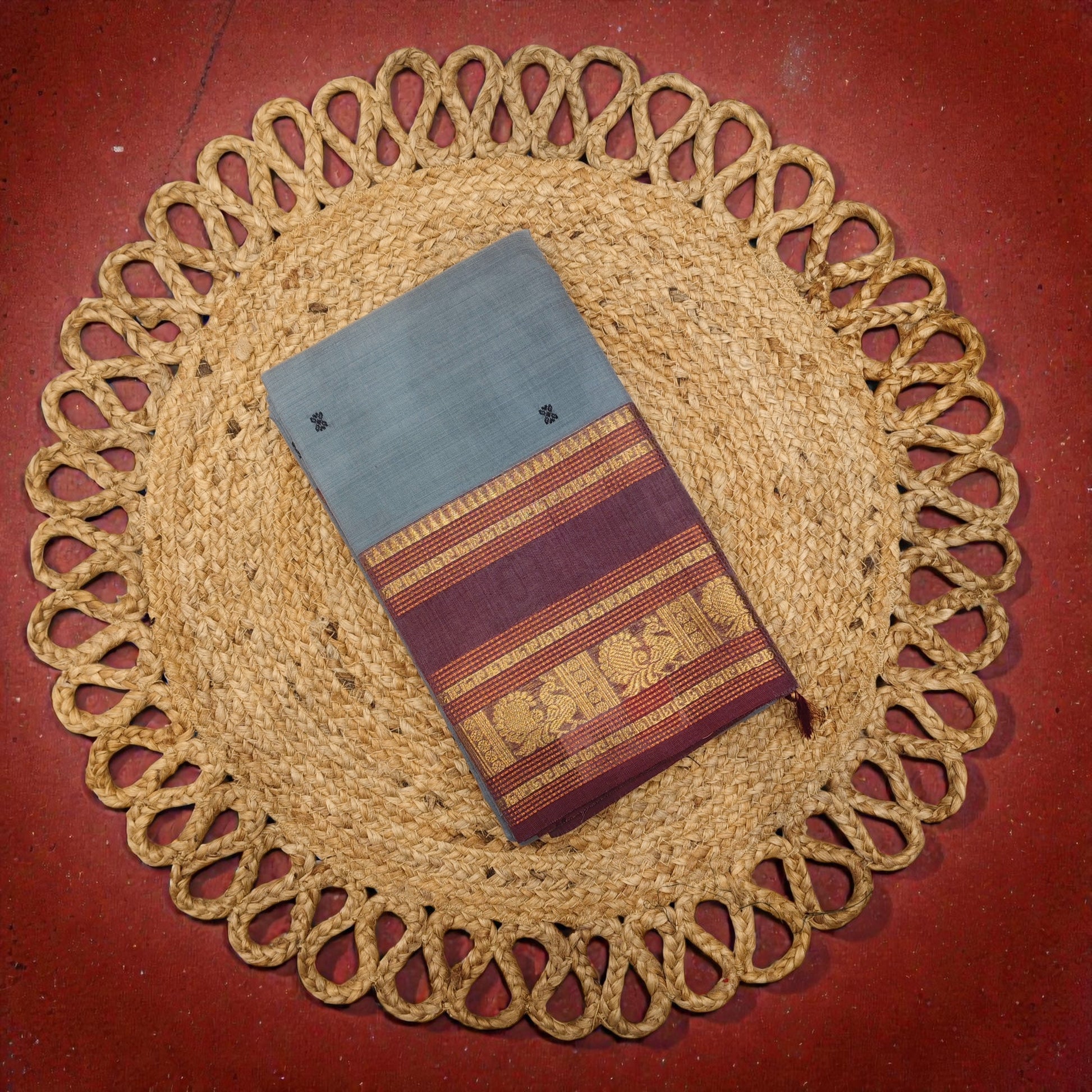 his saree is all about understated richness. The soft grey body with a coffee-brown and gold zari border gives it a refined traditional look. A great choice for workwear, daily ethnic styling, and anyone who prefers mature, elegant tones.