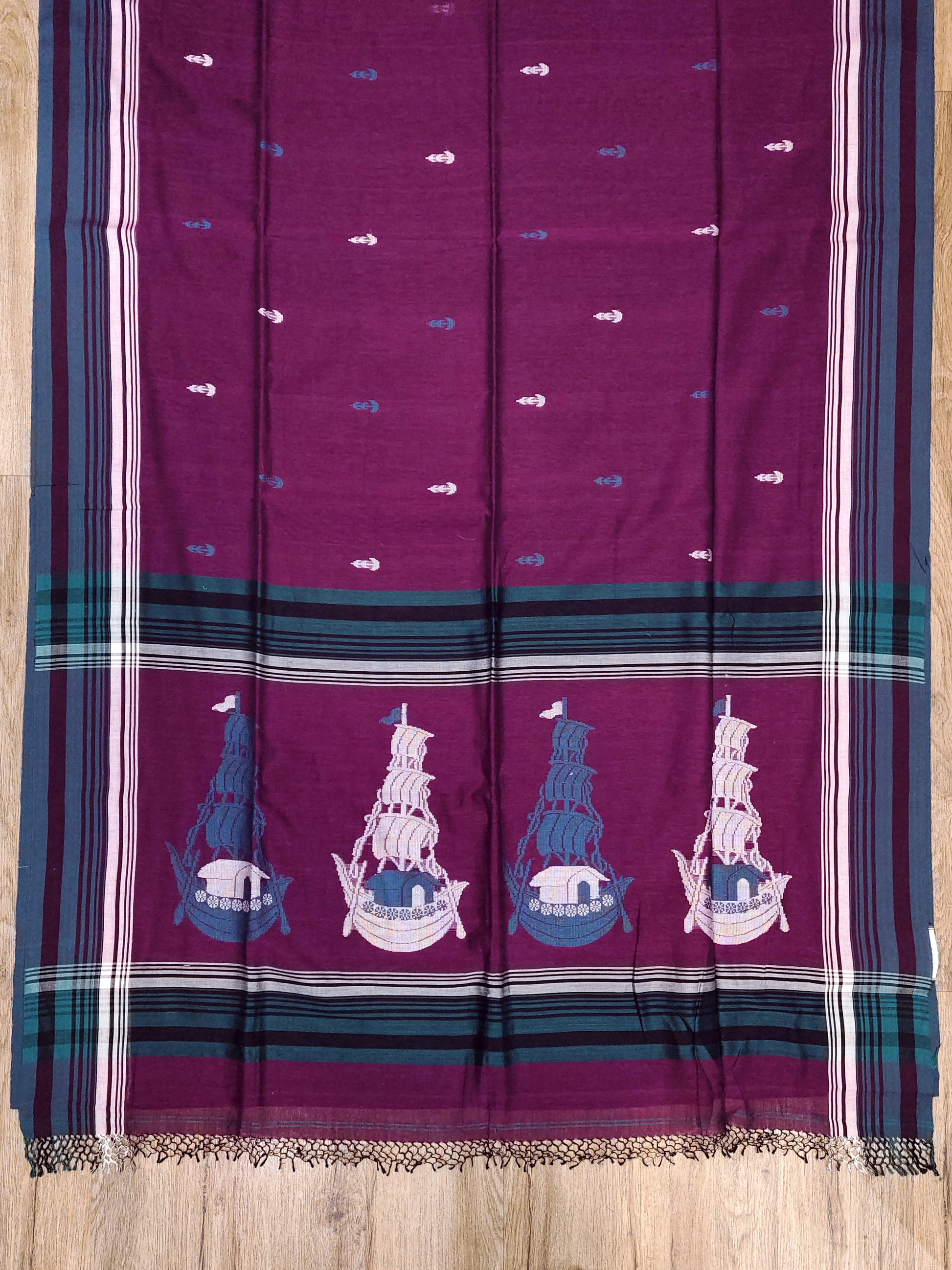 Elegant and distinctive, this Bengal handloom cotton saree is crafted in soft, breathable cotton that makes it ideal for comfortable all-day wear, especially during the summer season. The saree features delicate small woven bootis spread across the body, adding subtle charm and texture. The highlight of the saree is its beautifully woven pallu adorned with striking traditional boat motifs, inspired by Bengal’s rich river culture. A contrasting border further enhances the overall look, giving the saree a graceful and timeless appeal. Lightweight and easy to drape, this saree is perfect for daily wear, office wear, or casual traditional occasions.