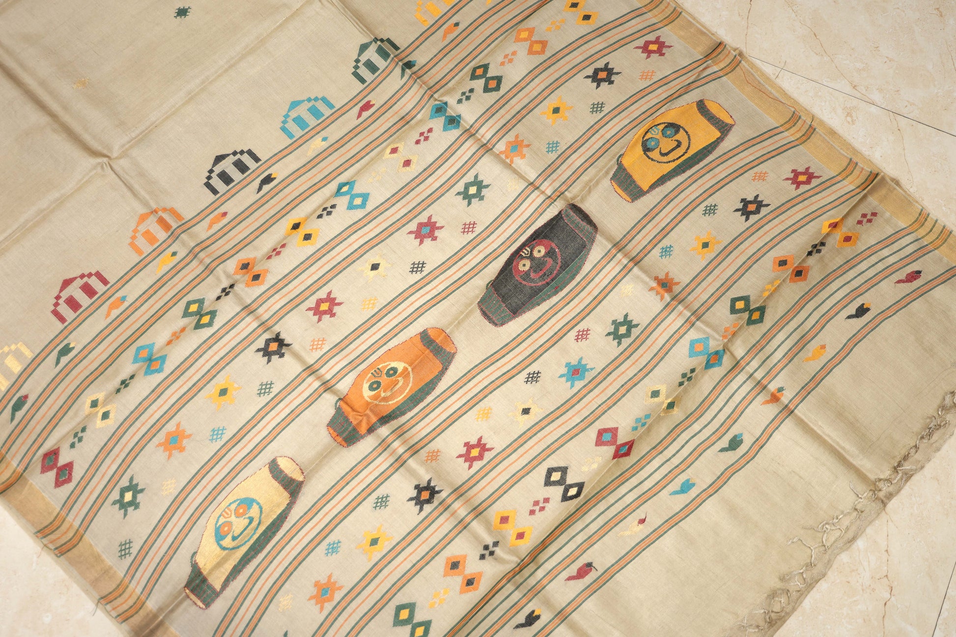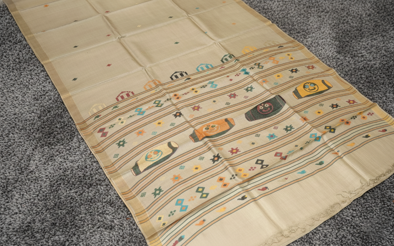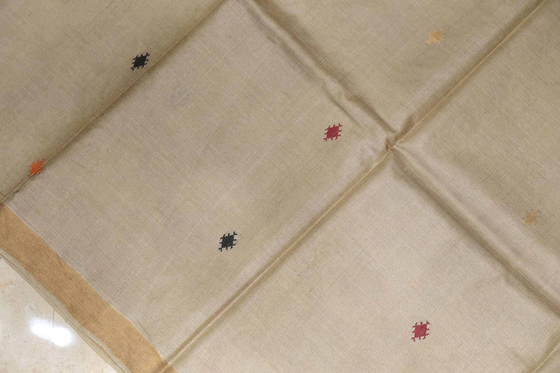 This pure Tussar silk saree features delicate woven booties across the body, adding subtle texture and charm. The saree is highlighted by a beautifully woven pallu with intricate detailing, reflecting fine craftsmanship and traditional artistry. Finished with a narrow zari border, it carries a graceful and timeless appeal.