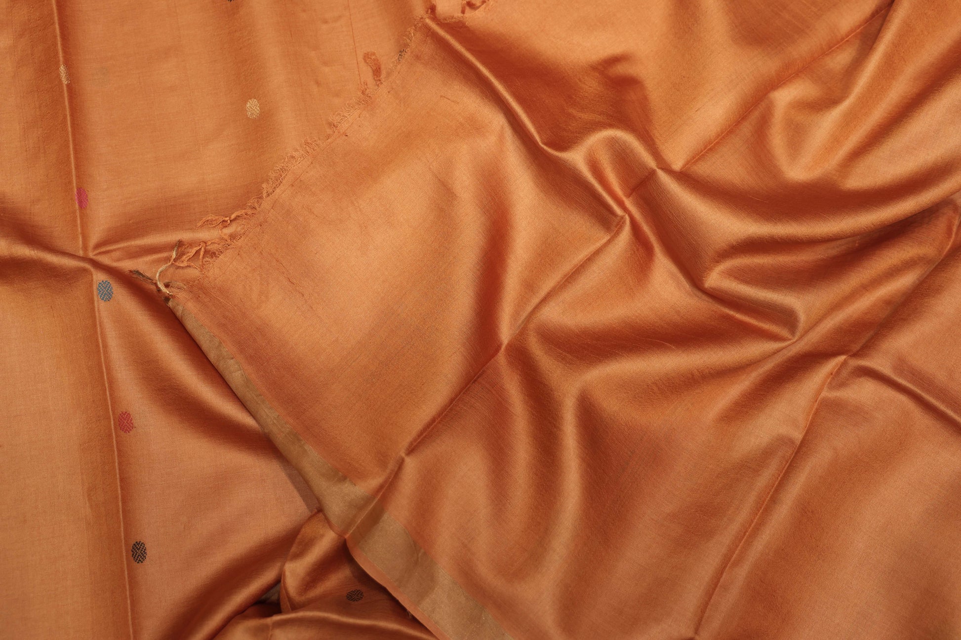 This pure Tussar silk saree features delicate woven booties across the body, adding subtle texture and charm. The saree is highlighted by a beautifully woven pallu with intricate detailing, reflecting fine craftsmanship and traditional artistry. Finished with a narrow zari border, it carries a graceful and timeless appeal.