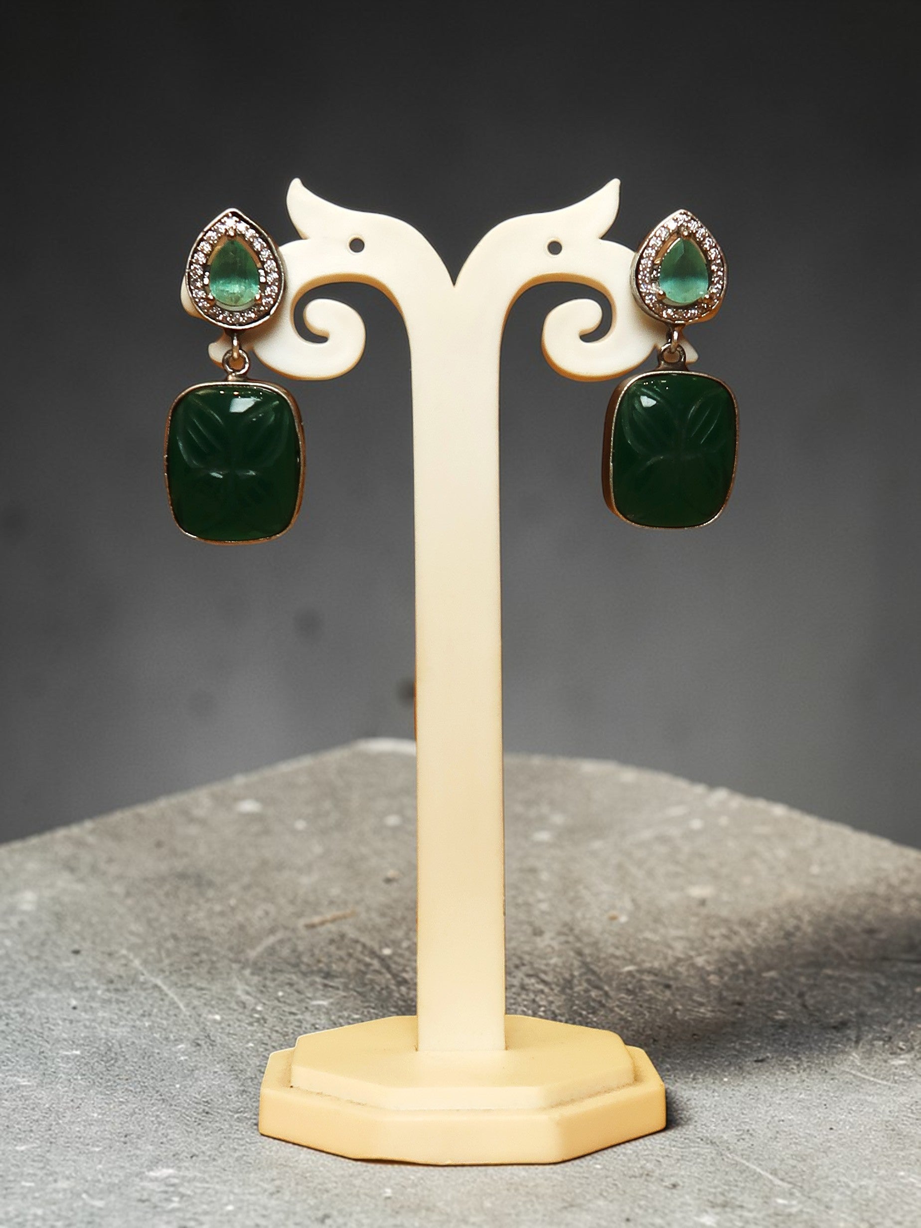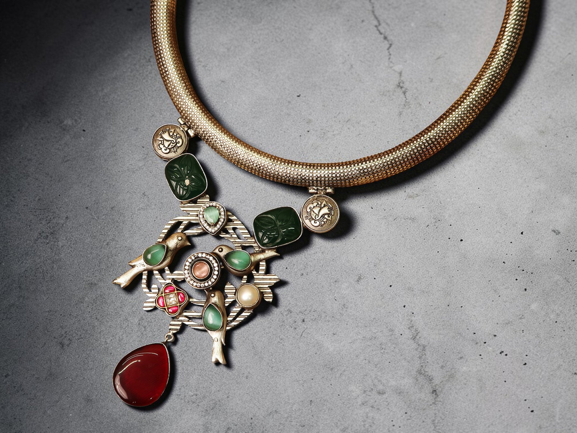 A beautifully crafted oxidised silver Hasli necklace set featuring a bold tribal-inspired pendant adorned with green stones and intricate detailing. The structured Hasli design adds a strong, traditional appeal, while the matching earrings complete the look effortlessly. Perfect for festive wear, ethnic outfits, or statement styling with sarees and fusion ensembles.
