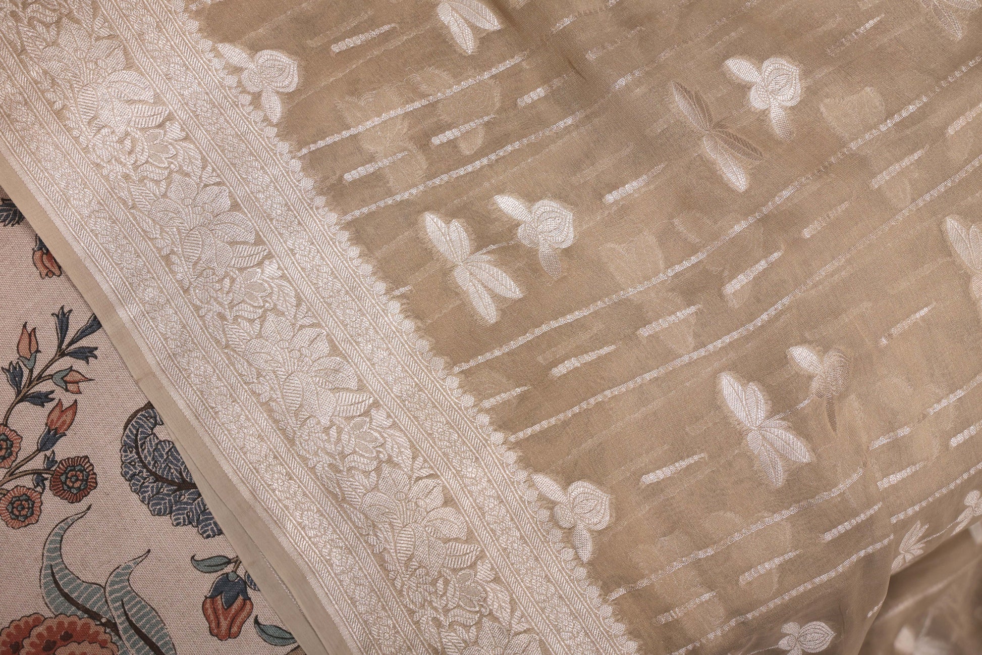 Ivory Beige Pastel Georgette Banarasi Saree with Silver Zari