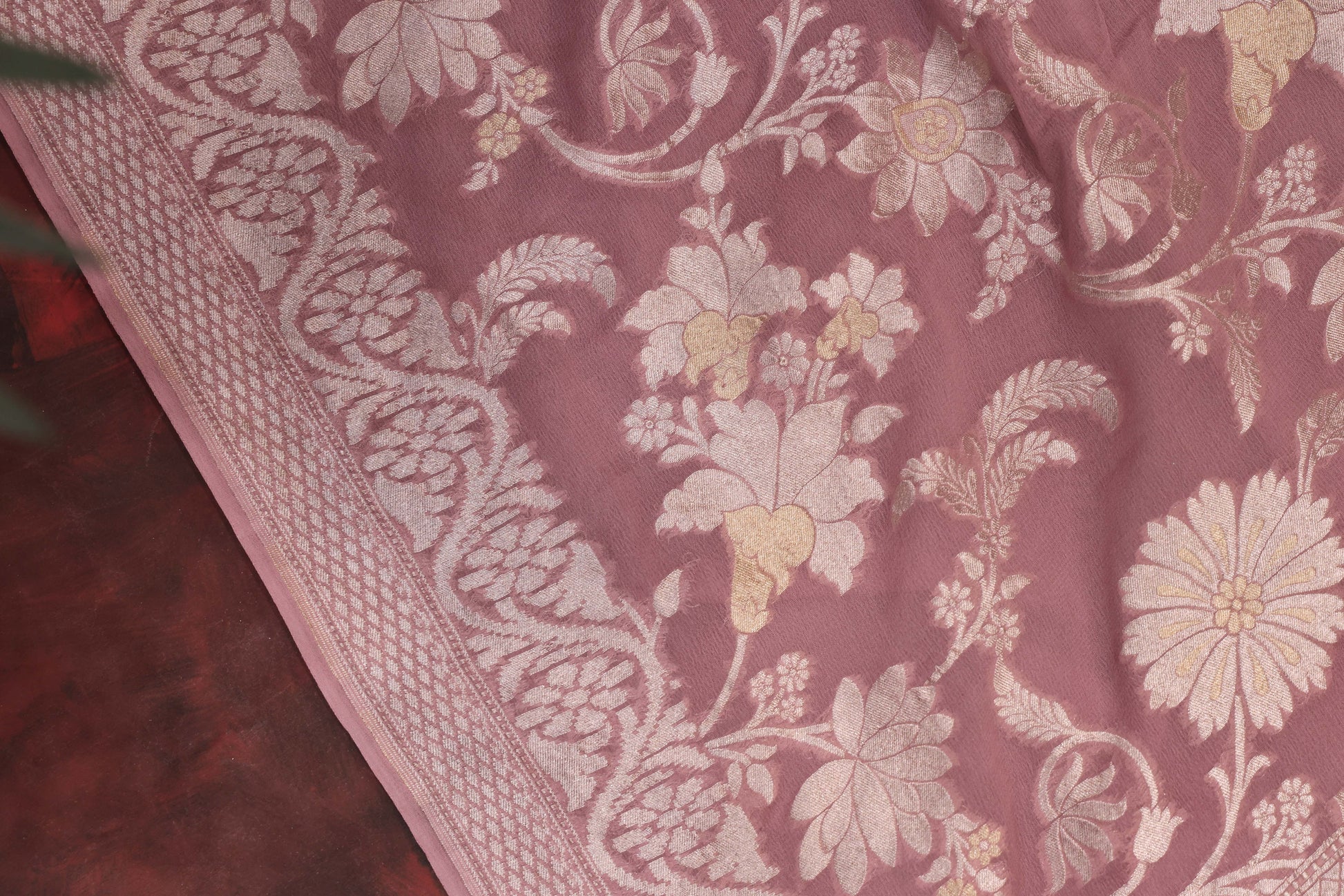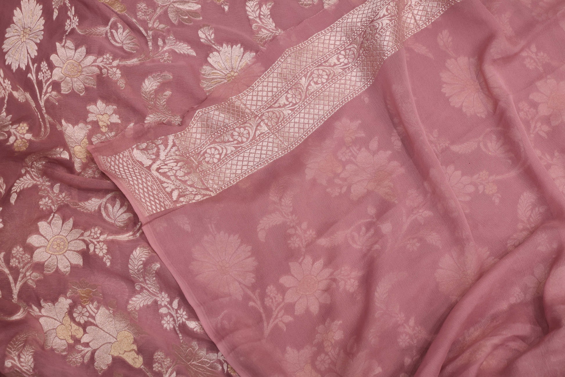 French Rose Georgette Banarasi Saree with Silver & Gold Zari