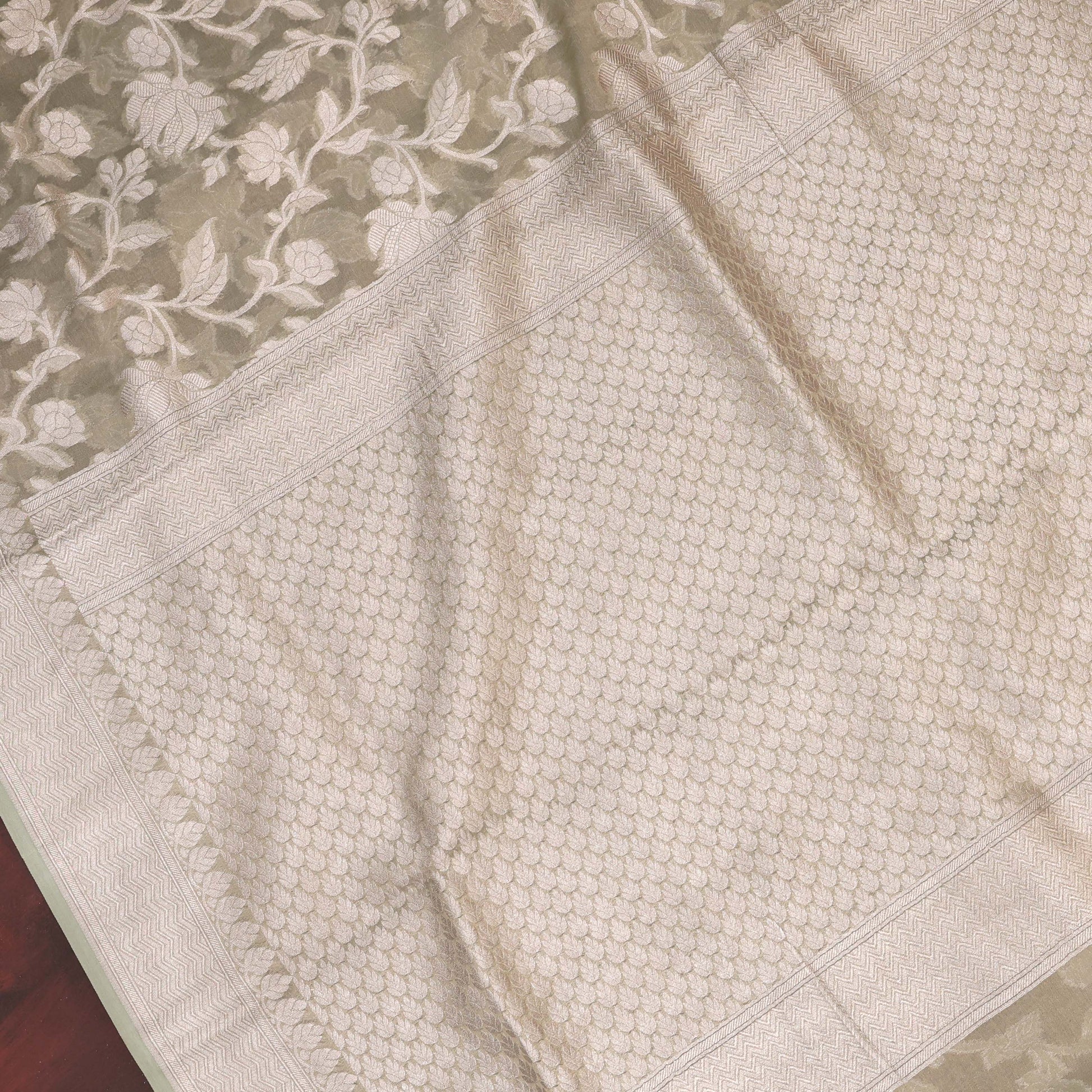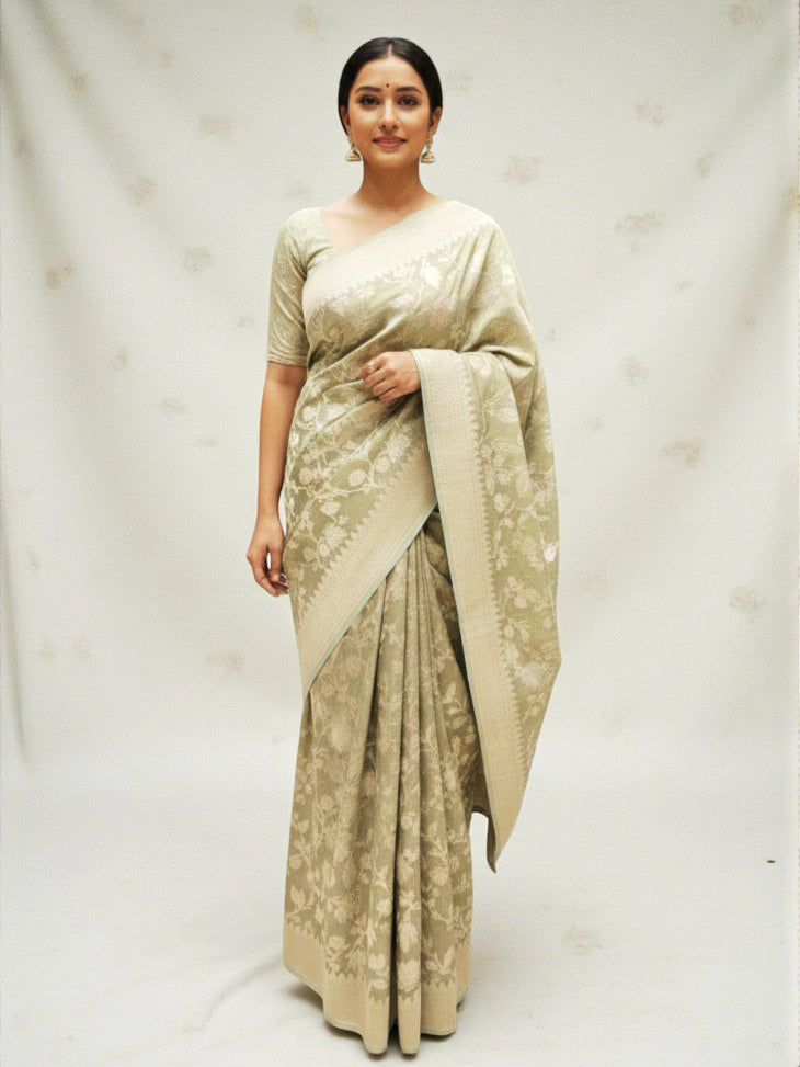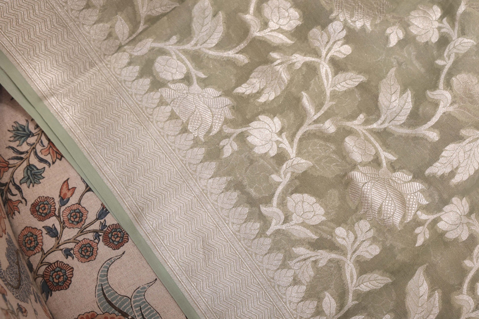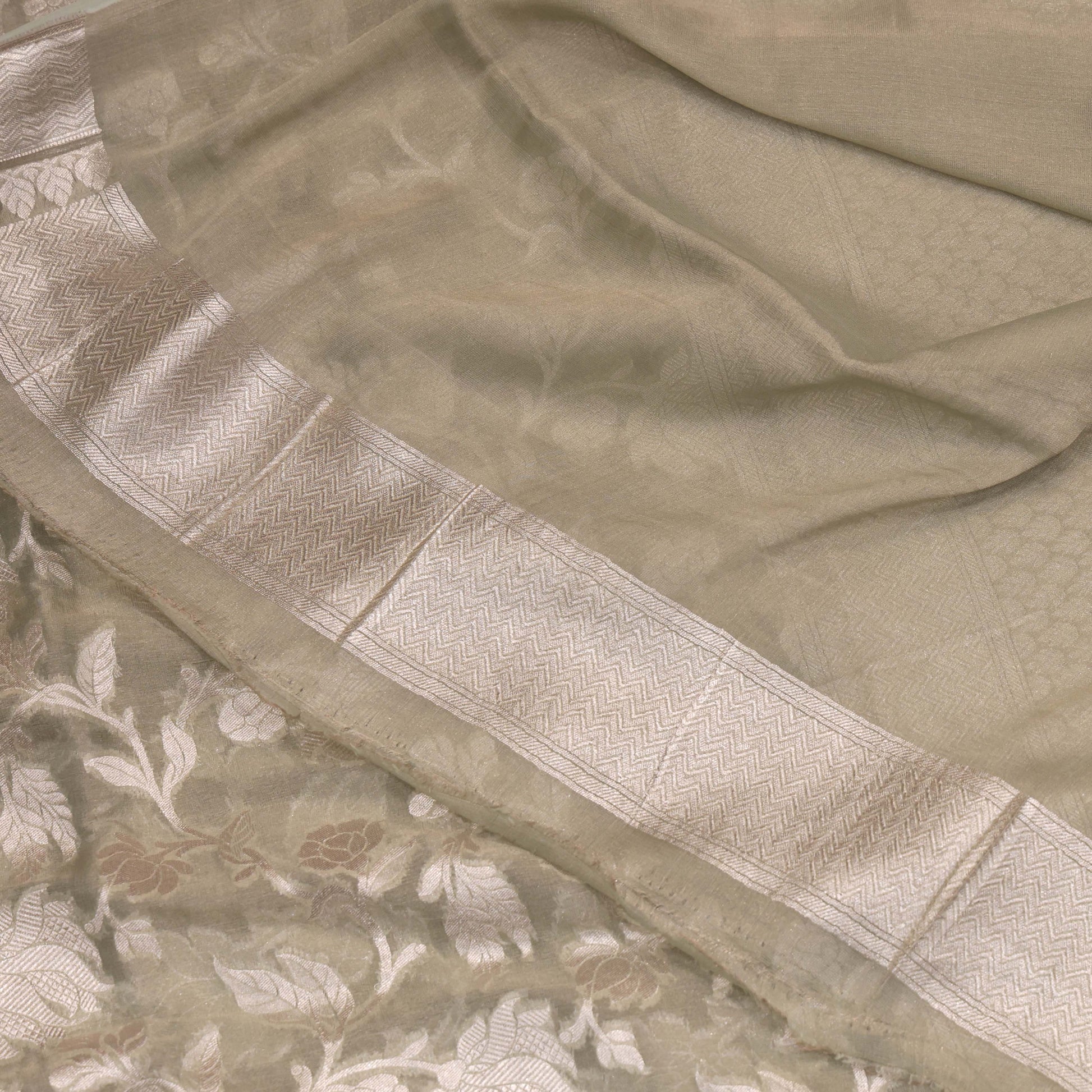 This pure hand-woven Banarasi georgette saree stands out with its calm, elegant shade and intricate weaving. Comfortable, breathable, and flattering, it is a versatile choice for refined occasion wear.