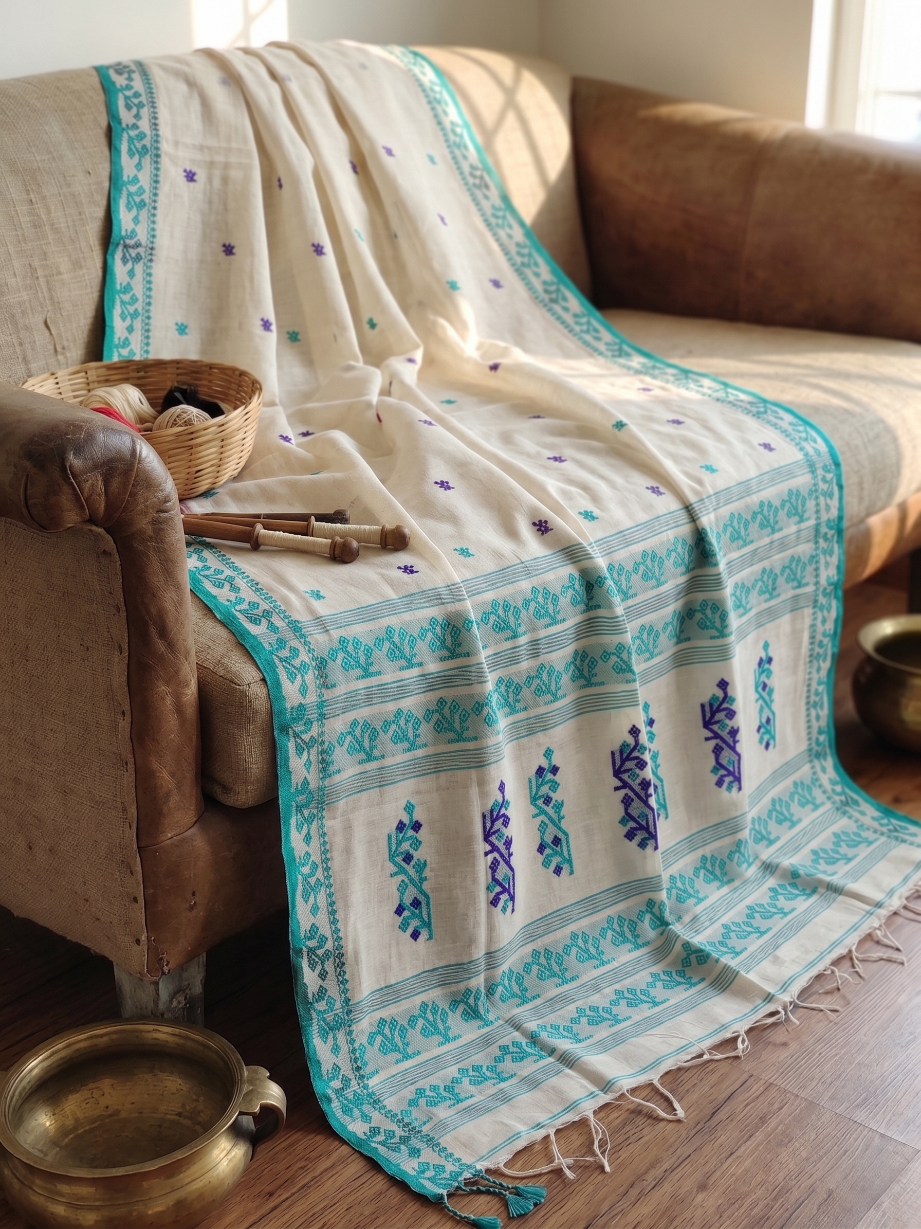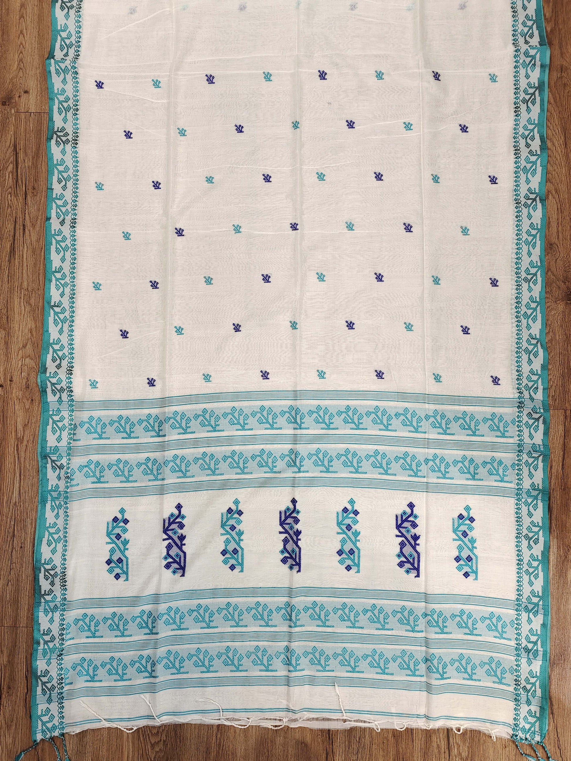 A classic Bengal handloom cotton saree in an off-white base, highlighted with delicate woven butis across the body. The teal woven border and intricately designed pallu add a refreshing contrast, giving it a graceful everyday appeal. Lightweight and soft, this saree is perfect for comfortable all-day wear, especially in warm weather.
