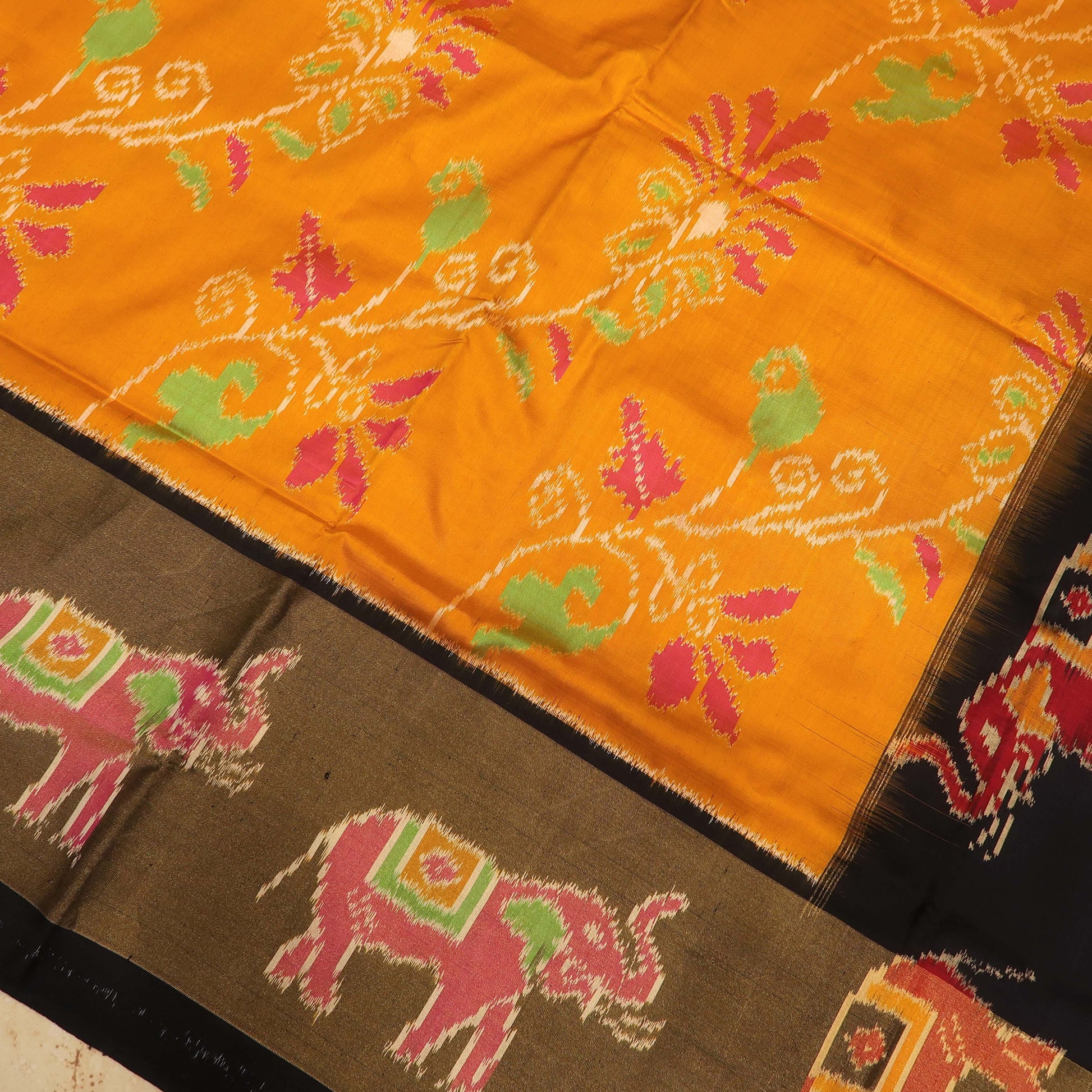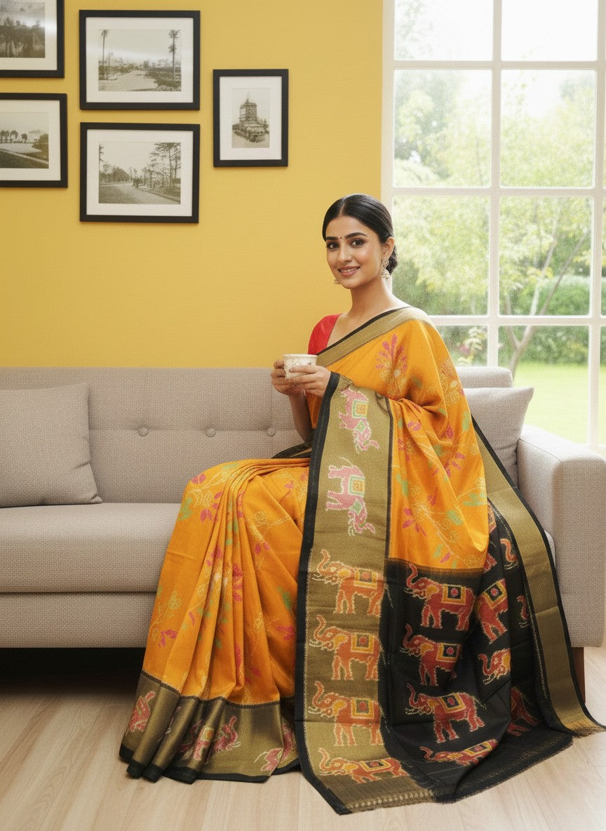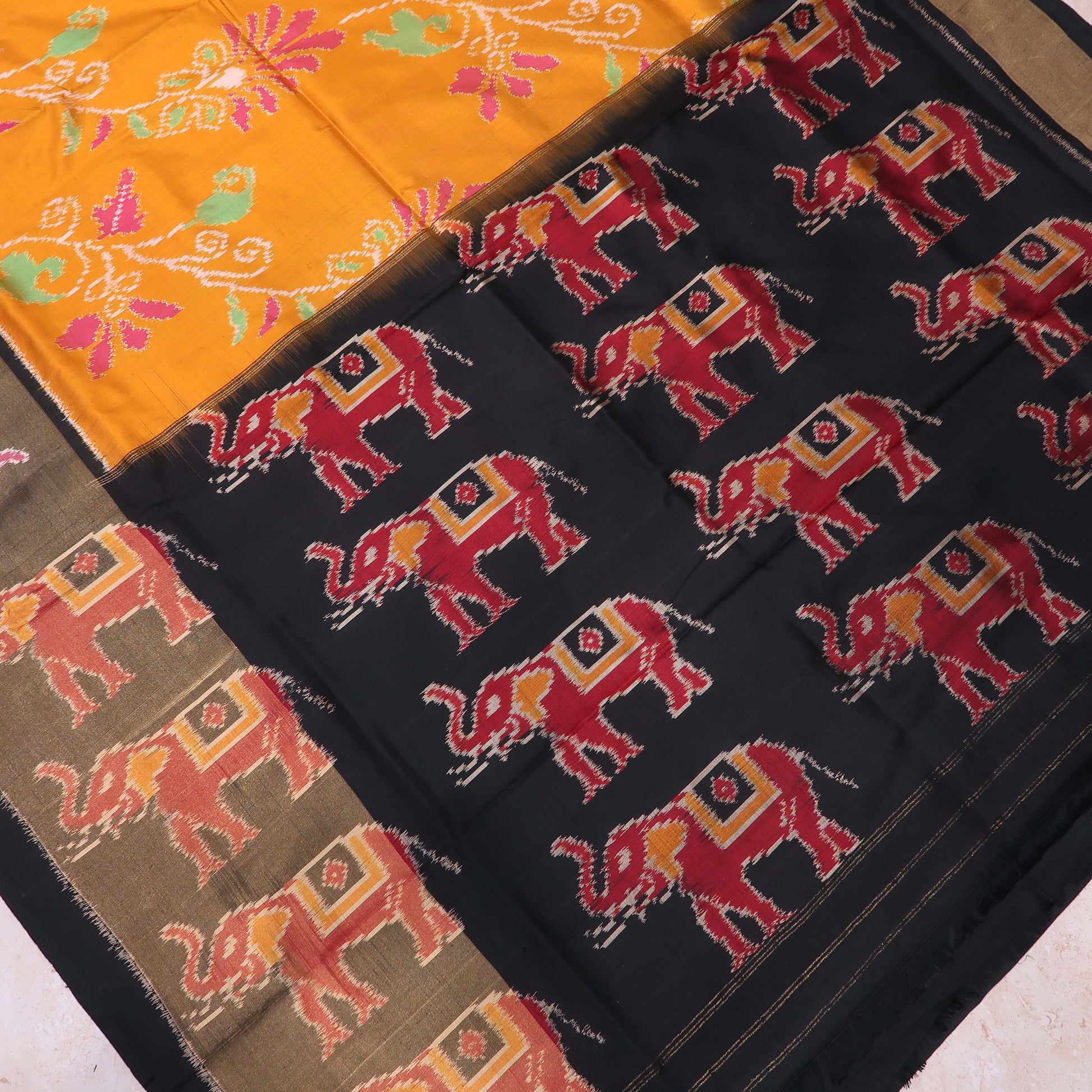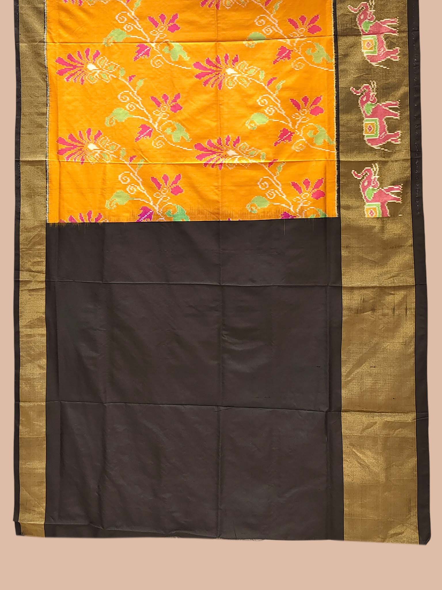 This Pure Pochampalli Silk Saree is handwoven in fine quality silk, showcasing a striking mustard-yellow body adorned with elegant floral ikat motifs in soft pink and green tones. The vibrant body is beautifully balanced by a deep black achal (pallu), highlighted with traditional elephant motifs woven in rich hues, adding a bold and regal character to the saree.