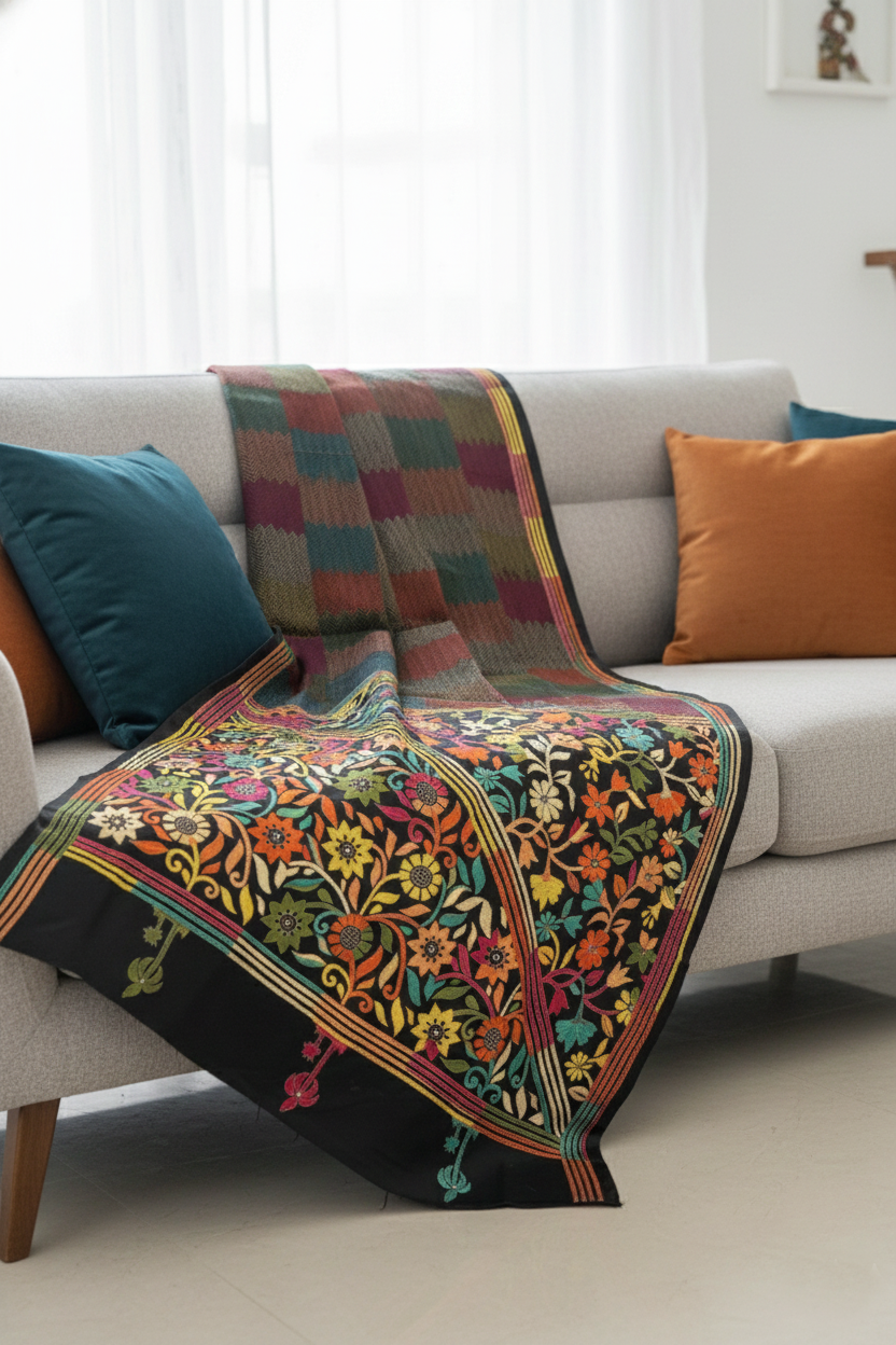 A timeless black saree elevated with traditional Katha hand embroidery, this piece features subtle detailing across the body, complemented by a vibrant multicolour floral border and pallu. Made from a semi Bangalore silk blend, the saree offers a fluid drape and silk-like finish while staying lightweight and affordable. The contrast floral embroidery adds a lively yet balanced charm, making this saree both elegant and versatile.
