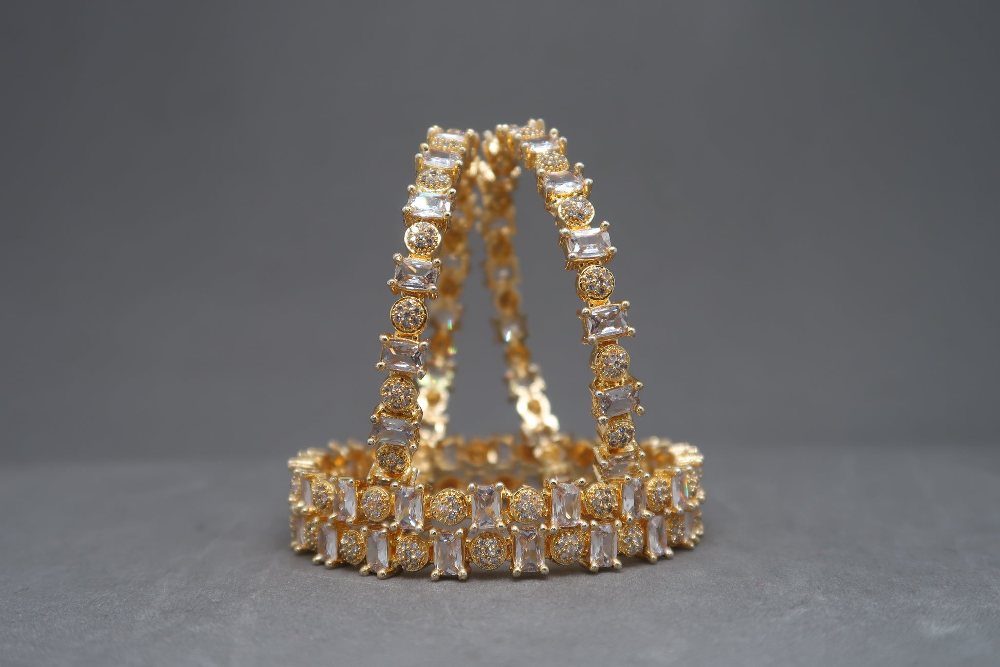 A sleek gold-finish bracelet featuring alternating baguette and round-cut stones. Modern yet sophisticated, ideal for evening wear. Size 2-4