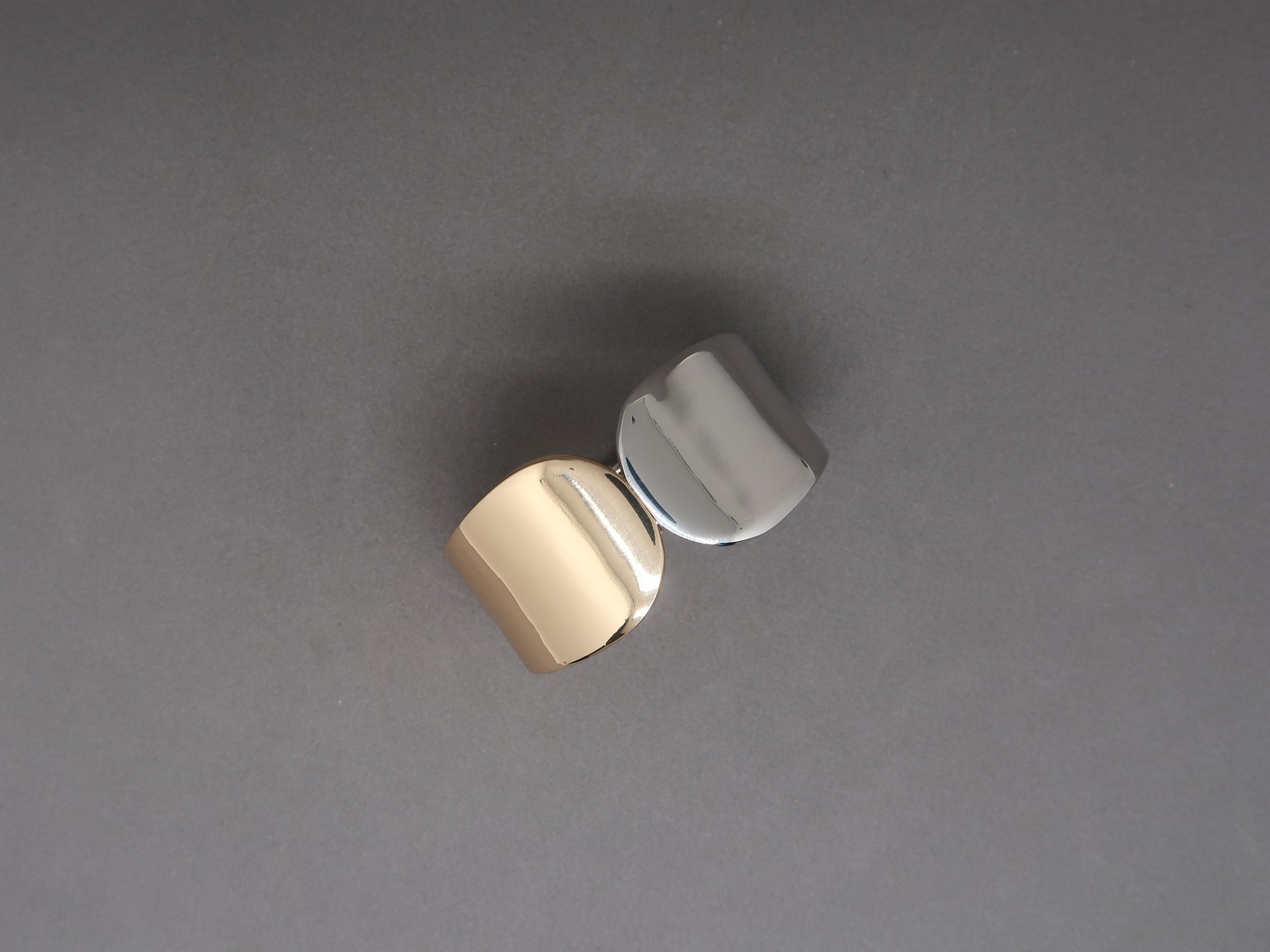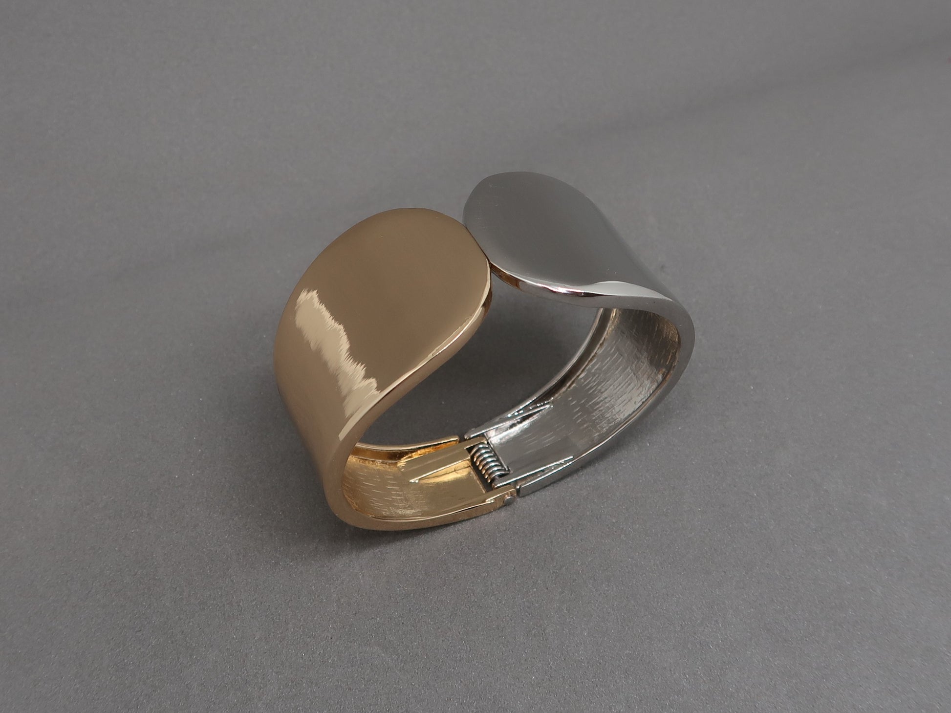 A contemporary open-style cuff combining gold and silver finishes. Its smooth curves add a bold, modern edge to any outfit.