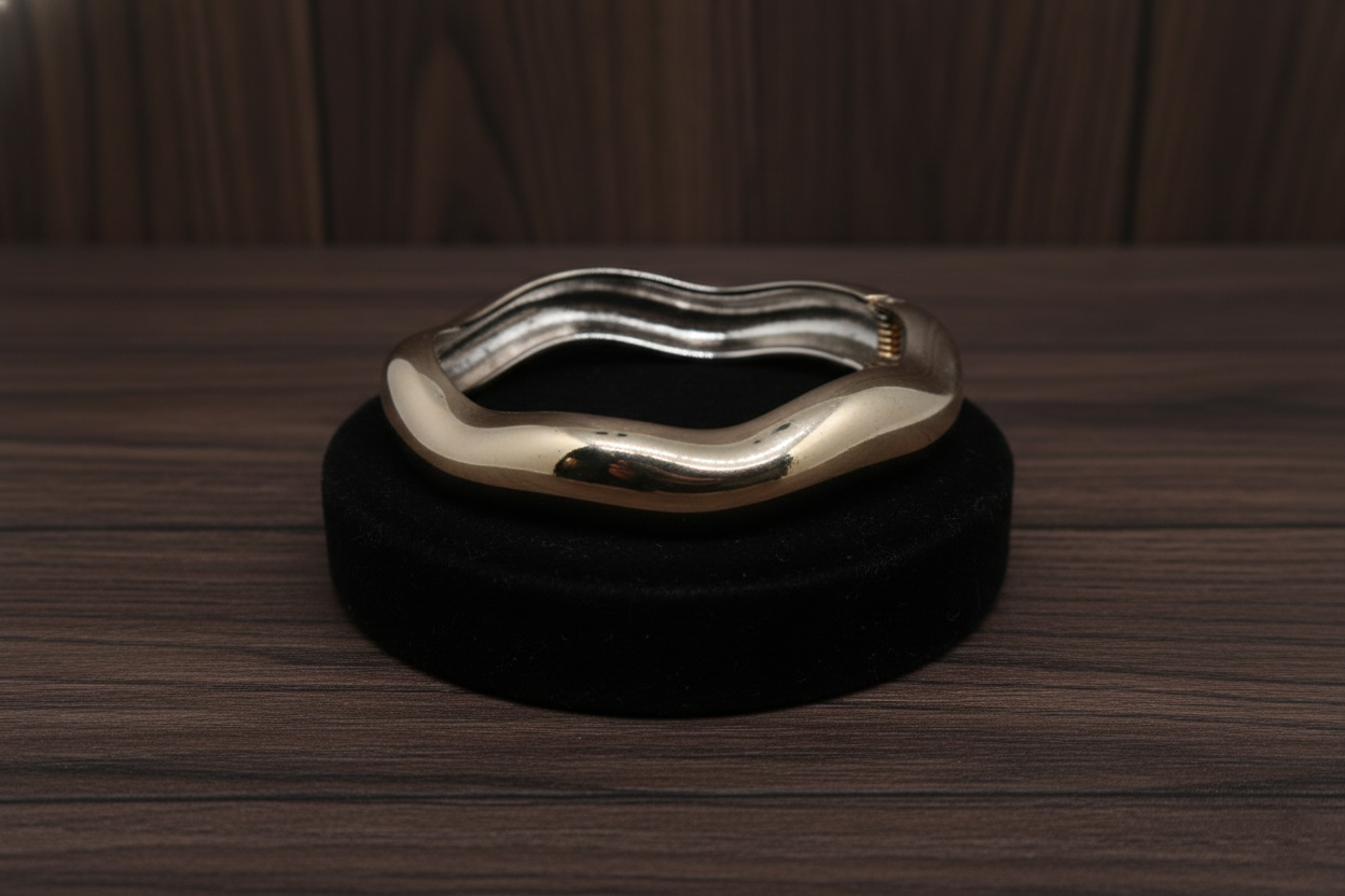 A bold yet minimal bracelet featuring a fluid wave-inspired design in dual metallic tones. The smooth, high-polish gold and silver finish creates a modern statement look. Designed with a secure clasp closure, this piece is perfect for contemporary styling, office wear, or elevating an Indo-western outfit with effortless elegance.