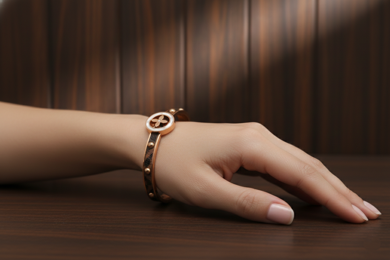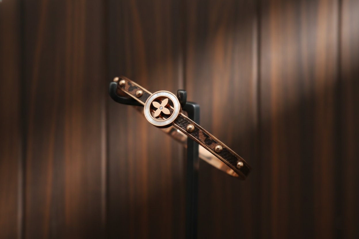A slim gold-tone bracelet with a delicate floral centerpiece and subtle detailing. Ideal for everyday elegance.
